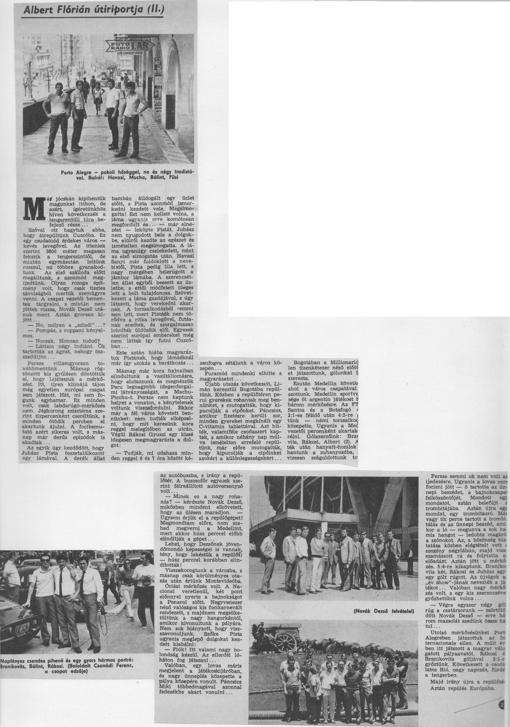 Ezután Medellin következett, ahol a város csapatával játszottunk. Medellin sportvezetősége öt argentin játékost bérelt három mérkőzésre. Az FTC, a Santos és a Botafogó ellen 2:1-es félidő után 4:2-re győztünk — némi torzsalkodások közepette. Ugyanis a Medellin vezetői percenként akartak cserélni. Gólszerzőink: Branikovits, Rákosi, Albert (2). A játék után hanyatt -homlok rohantunk a zuhanyozóba, félig vizesen száguldottunk tovább az autóbuszba, s irány a repülőtér. A buszsofőr egyesek szerint félreállított autóversenyző volt…