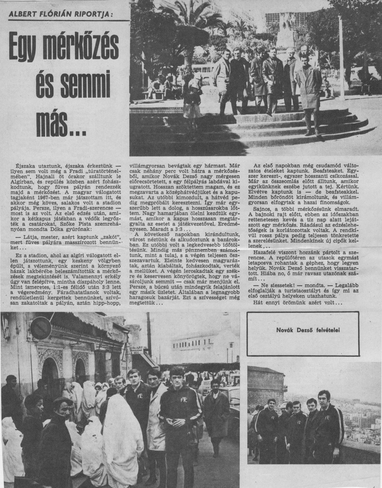 Éjszaka utaztunk, éjszaka érkeztünk — ilyen sem volt még a Fradi „túratörténelmében”. Hajnali öt órakor szálltunk le Algírban, és repülés közben azért fohászkodtunk, hogy füves pályán rendezzék majd a mérkőzést. A magyar válogatott tagjaként 1967-ben már játszottam itt, és akkor még köves, salakos volt a stadion pályája. Persze, ilyen a Fradi-szerencse — most is az volt. Az első edzés után, amikor a kétkapus játékban a védők legyőzték a csatárokat, Szőke Pista szemrehányóan mondta Dóka gyúrónak: