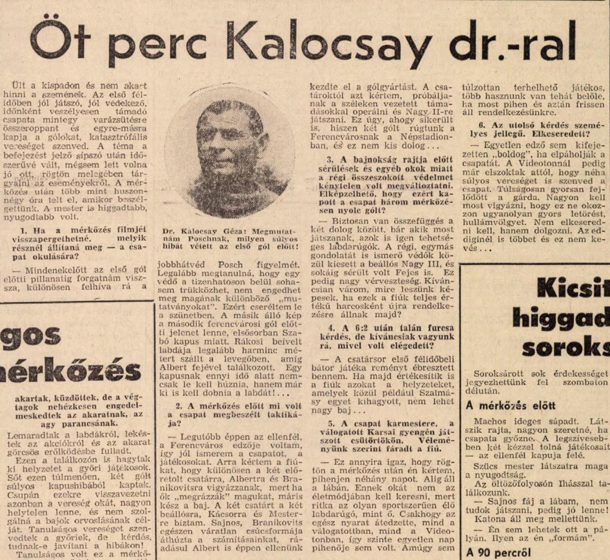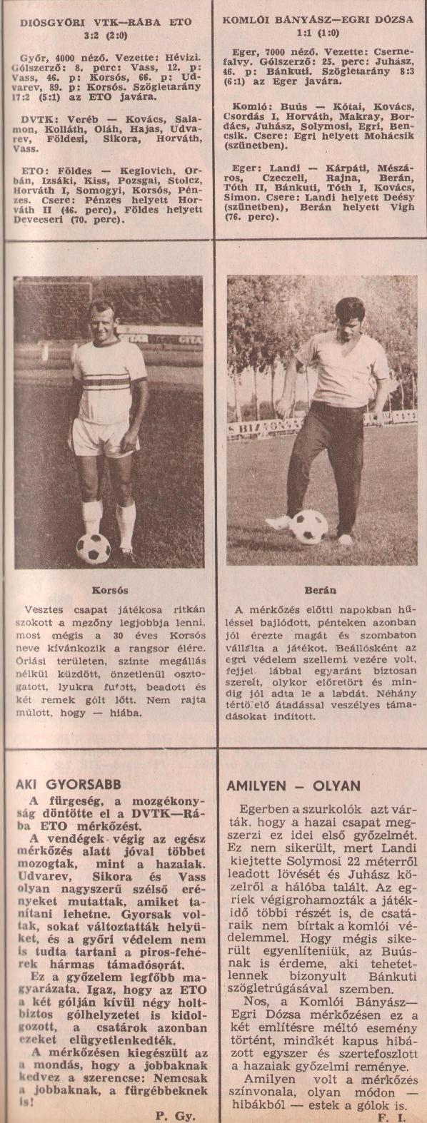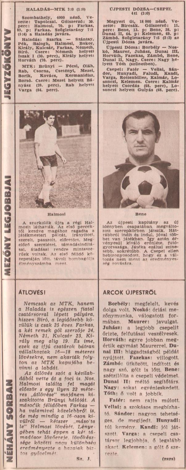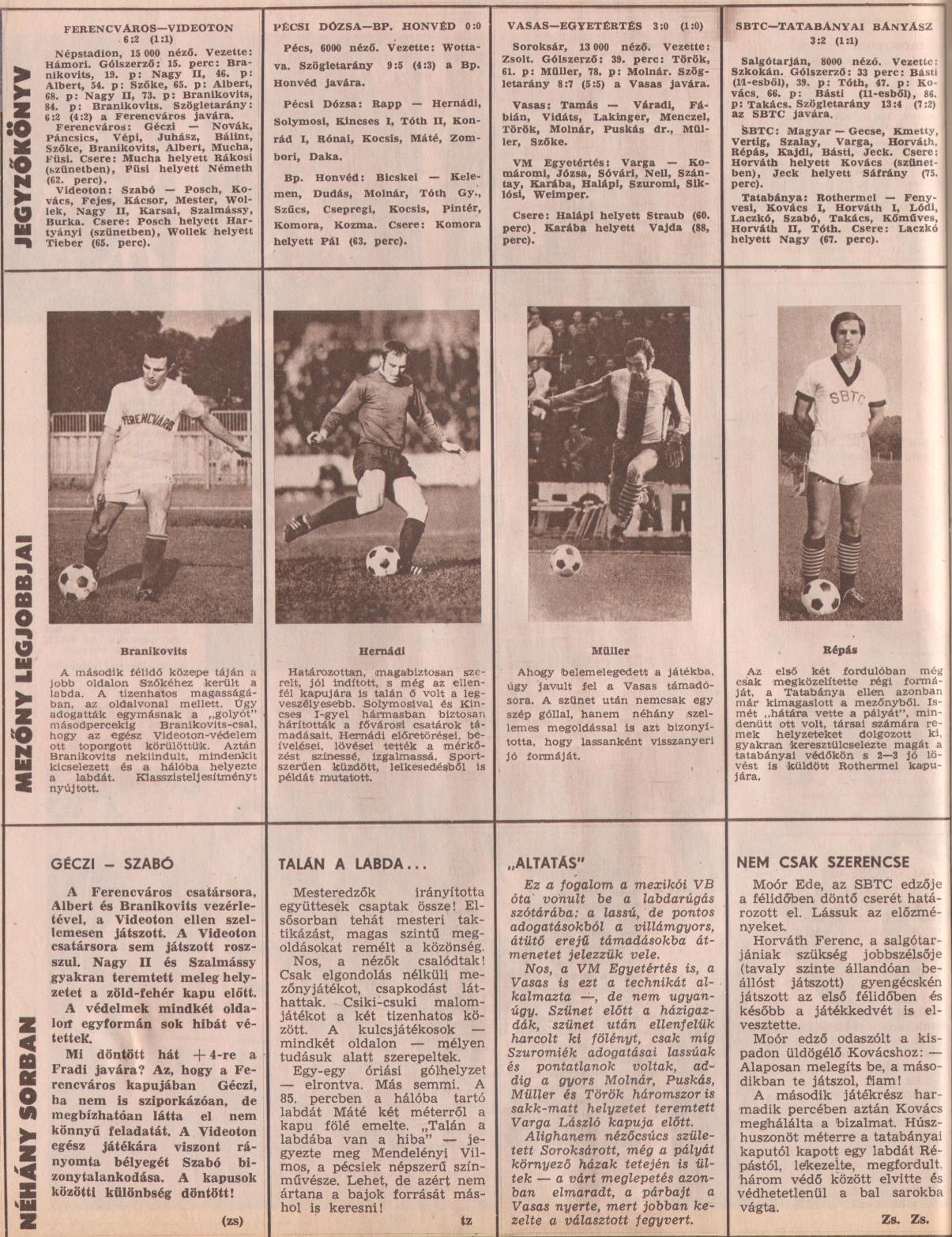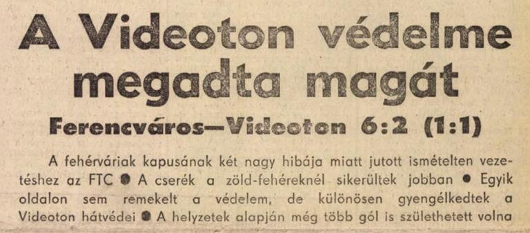 Ráadásul jó dolog úgy felkészülni és ráhangolódni a következő bajnoki mérkőzésre, hogy közben kutakodunk a dicső múltunkban. Főleg úgy, hogy nem nehéz emlékezetes és győztes meccseket találni. Ezért általában úgy próbáljuk kiválasztani az aktuális mérkőzést, hogy olyan év szerepeljen, mely az eddigi visszaemlékezéseinkben ritkábban szerepelt. A mostani időpont kiválasztásánál még az is számított, hogy az ellenfelünk az évek során többször változtatta a nevét (MOVE, Székesfehérvár, Videoton, Parmalat, Fehérvár) és mivel jelenleg ismét Videoton néven szerepel, ezért esett a választás egy igazán gólzáporos 1971-es mérkőzésre. Akik igazából járatosak a magyar bajnokságok történetében, azok tudják, hogy a hetvenes években bár mindig kiváló csapataink voltak, de bajnoki aranyérmet csak 1975/76-os szezonban akasztottak a fiúk nyakába, mert ezen évtizedet az örök ellenség legendás csapata (csatársora) határozta meg és talán ezért fordultunk ritkábban ehhez az időszakhoz. Talán nem véletlen, hogy az 1971-es újságban is, a mérkőzés beszámolója mellett, éppen a legendás (és becsülettel el kell ismerni, tényleg az volt) csatártrióval készült cikket lehet olvasni. Persze, ha a zöld-fehér szemünk egyáltalán képes egy ilyen írást elolvasni. Bevallom, bár tisztelem őket, de az én szemem is inkább az újság jobb oldalát figyelte: Ferencváros-Videoton 6:2 (1:1), Népstadion, 15 ezer néző.