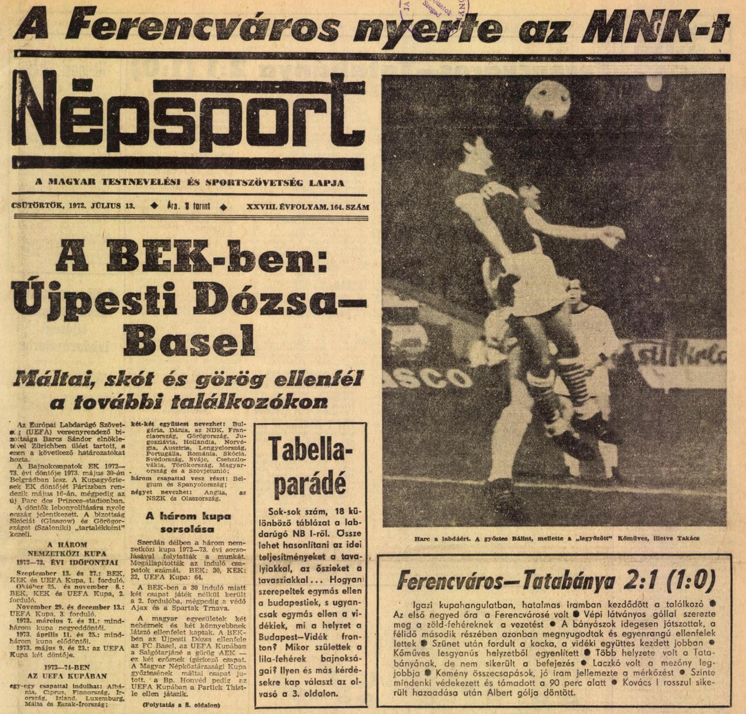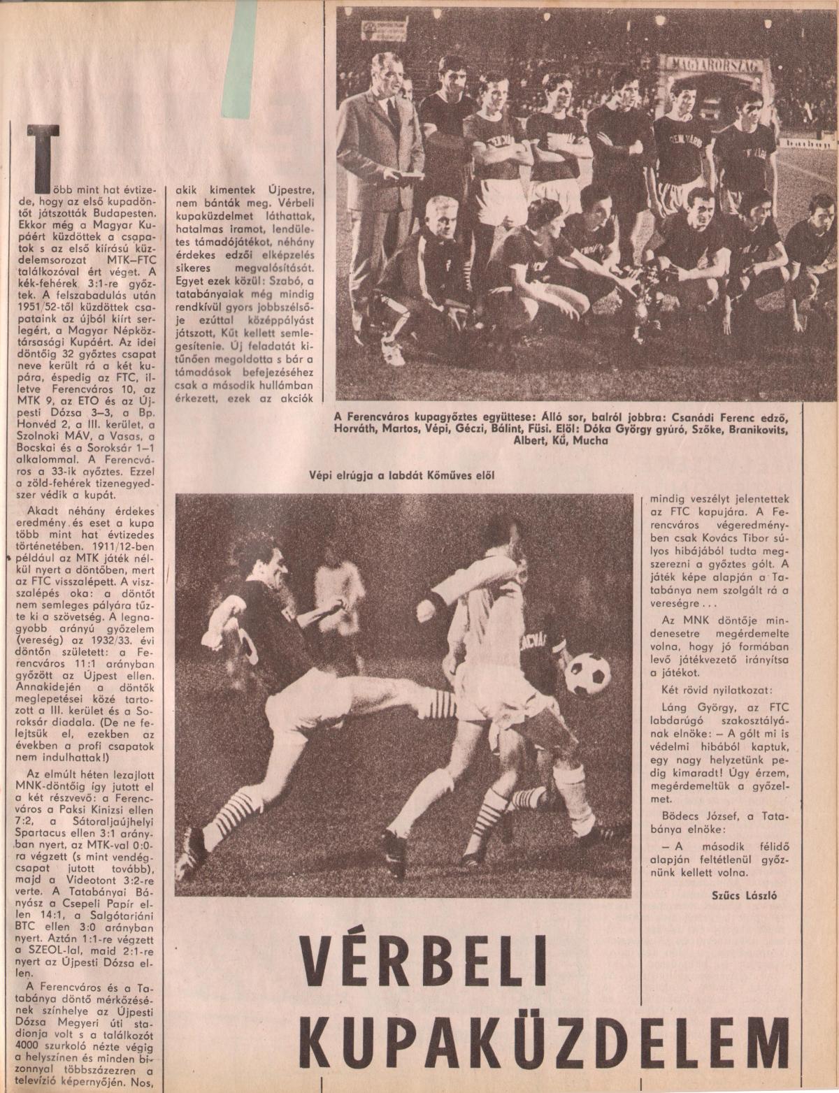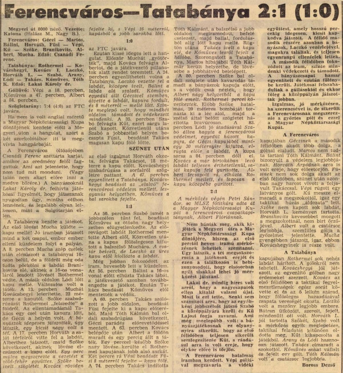 A tudósítás szerint a Ferencváros egy izgalmas, jó mérkőzésen, egy kis szerencsével nyerte meg a kupát, Vépi és Albert góljaival. A mérkőzés külön pikantériája, hogy a Tatabánya kispadján dr. Lakat Károly ült, aki a hatvanas évek végén három évig volt a Fradi edzője, két bajnoki címmel és egy harmadik helyezéssel.