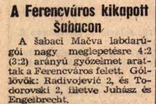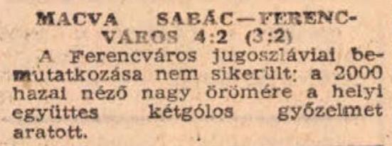 Elutaztak. Az FTC labdarúgói szombaton reggel elutaztak Jugoszláviába, ahol több előkészületi mérkőzést játszanak. Szőke, sérülése miatt, nem tarthatott a csapattal, amelynek tagjai: Géczi, Vörös, Vépi, Páncsics, Megyesi, Bálint, Martos, Juhász, Horváth, Füsi, Engelbrecht, Branikovits, Mucha, Bartosik és Bányai. A küldöttséget Som Ferenc, a klub elnökhelyettese és Novák Dezső edző vezeti.
