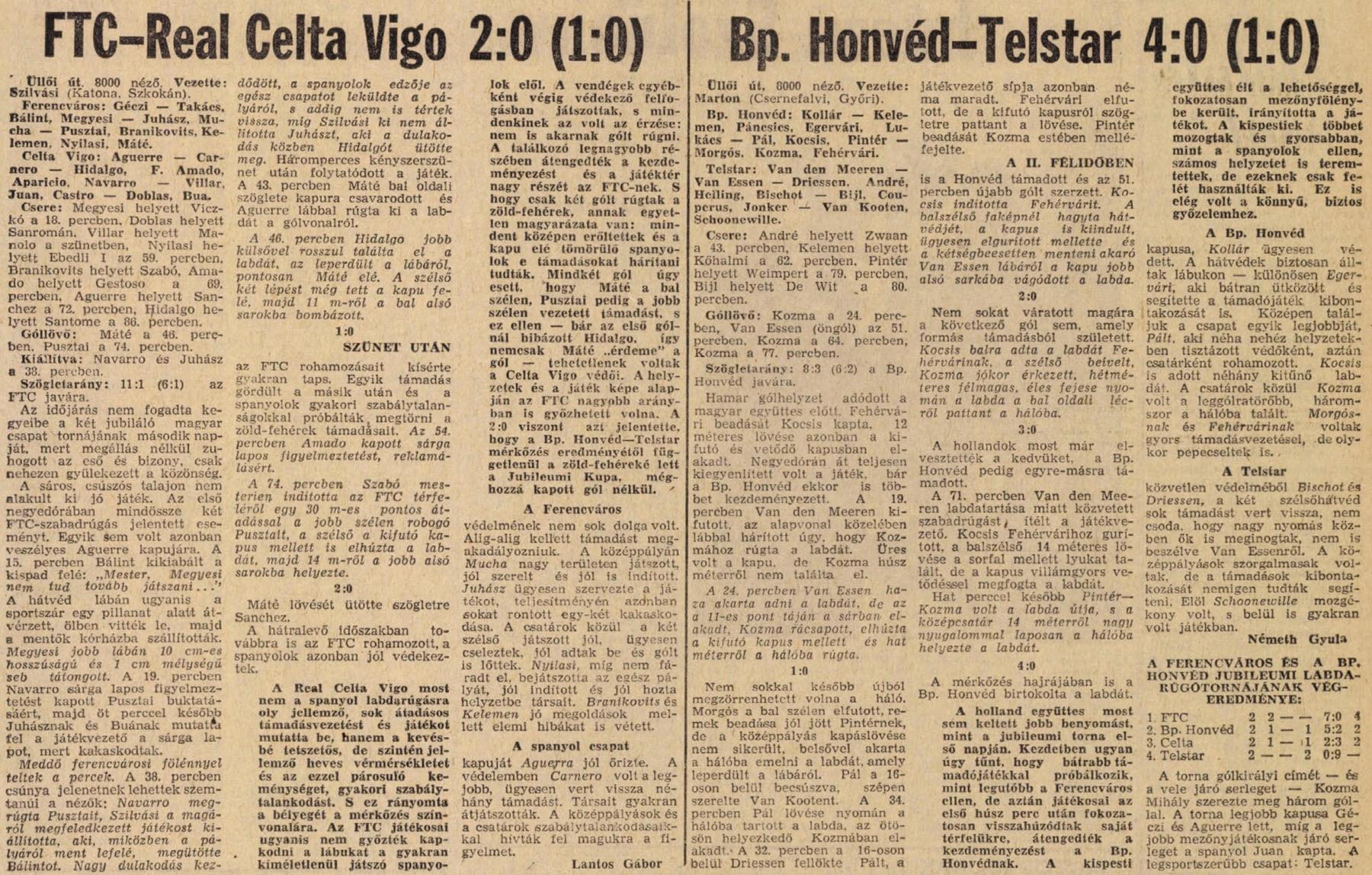 1974.VIII.11. NT, Ferencváros – Real Celta Vigo 2:0
