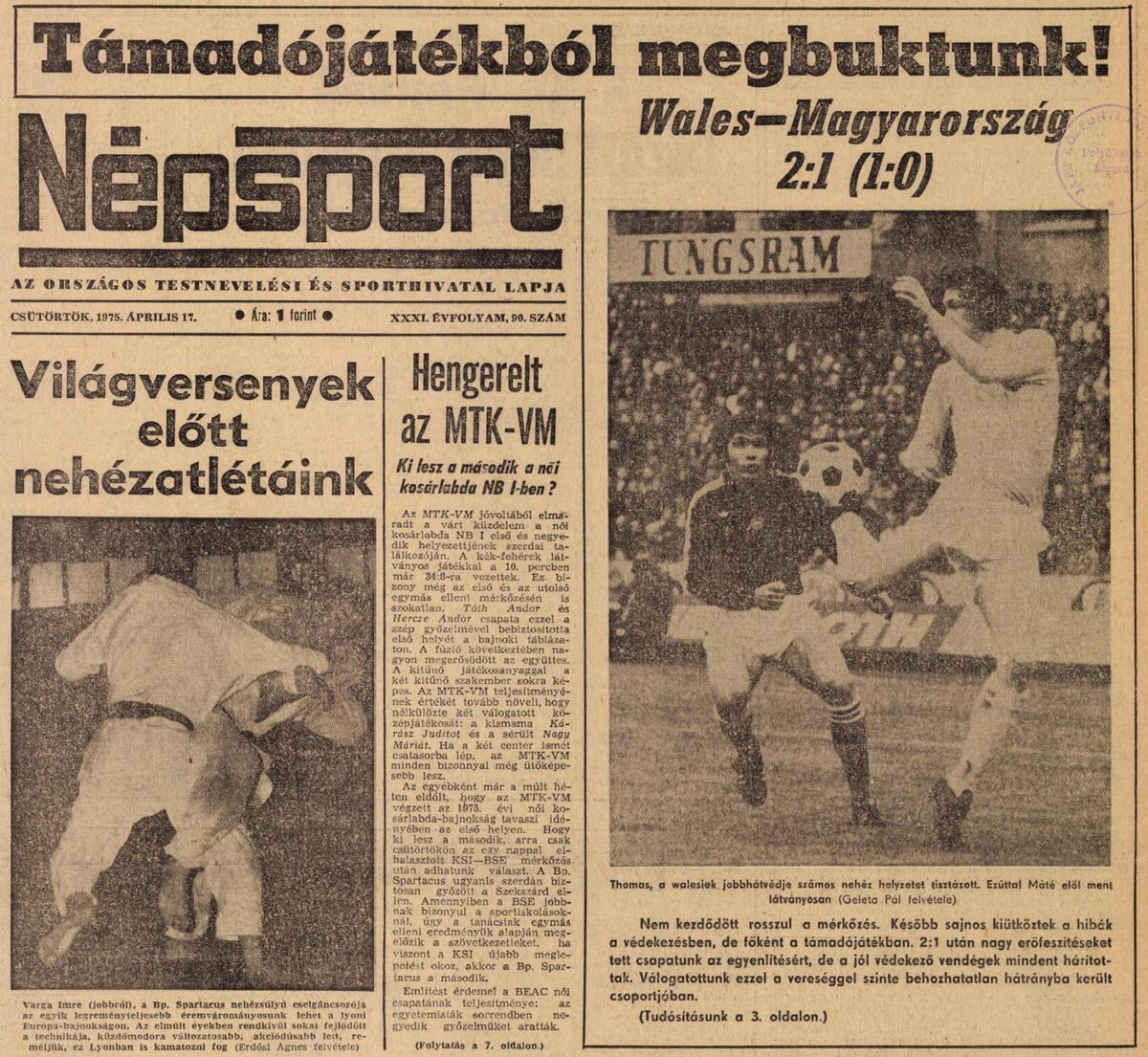1975. április 16. MAGYARORSZÁG—WALES 1:2 (0:1) EB-selejtező