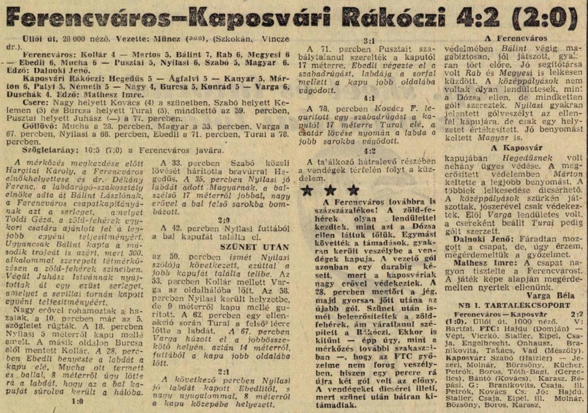 Érdemes megnézni a nézőszámokat. Hétközi forduló volt(!), akkor még mindenki dolgozott, aki műszakból stb. ki tudott érni, csak az volt kint a meccsen. Villanyvilágítás még csak a Népstadionban, Újpesten és -talán- Kispesten volt , vidéken sehol. A tartalékcsapatunk összeállítását nézve: Ma tuti dobogós lenne az NB1-ben.