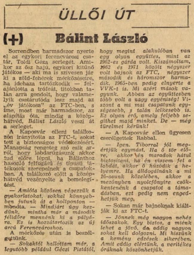 Egészen odáig, mely már az égiek privilégiuma, de tudjuk, a példabeszédek először nem a bibliában jelentek meg, azok eredetét a görög kultúrában kell keresnünk, hiszen eredetileg egy olyan történetet jelöl meg mely az igazságra kíván rávilágítani, de nem közvetlen formában, hanem valamely eseményre, példára hivatkozva. Ha ebbe a magyarázatba ágyazzuk szerkesztőtársam választását, talán már közel is kerültünk az igazsághoz. Az persze más kérdés, hogy célszerű-e az 1975-ös Ferencvárosát példaként a jelen elé állítani, hiszen tudjuk jól, más időket éltünk, mások voltak a társadalmi viszonyok és bizony mások voltunk mi magunk is.