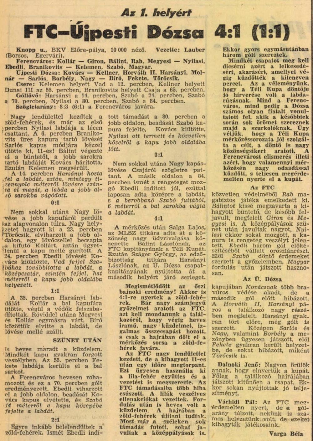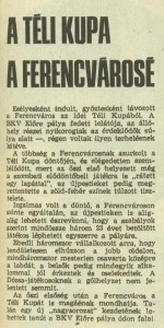 Betartva a „fontossági” sorrendet először a gázolásról néhány mondatot. Először kivégzést akartam írni, de mivel egyszer már meg lettem fedve egy szóért, amit előszeretettel használtam az Újpesti Dózsával kapcsolatban, így egy kicsit finomítottam a jelzőn. Ettől még, amikor először megláttam az újságot, szemem nem a főcímen akadt meg („A Ferencváros nyerte a Téli Kupát!”), hanem a mérkőzés eredményén: FTC – Újpesti Dózsa 4:1! Kell ennél szebb látvány egy Fradista szívnek?