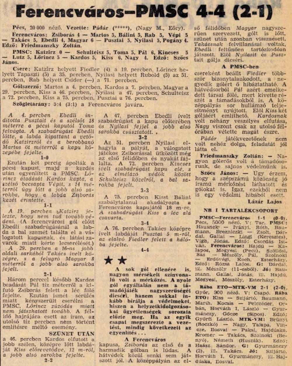 Sokgólos találkozó. Háromszor a Ferencváros vezetett és a pécsiek egyenlítettek, majd a hajrában a PMSC szerzett vezetést, de a Ferencváros egy perc múlva egyenlíteni tudott. Végeredményben a húszezer néző, ha az eredményben nem is, de a játékban csalódott. A gólokat Martos, Magyar, Nyilasi, Pusztai, illetve Kardos, Kiss (2) és Schulteisz szerezte. A találkozót Pádár Jól vezette