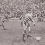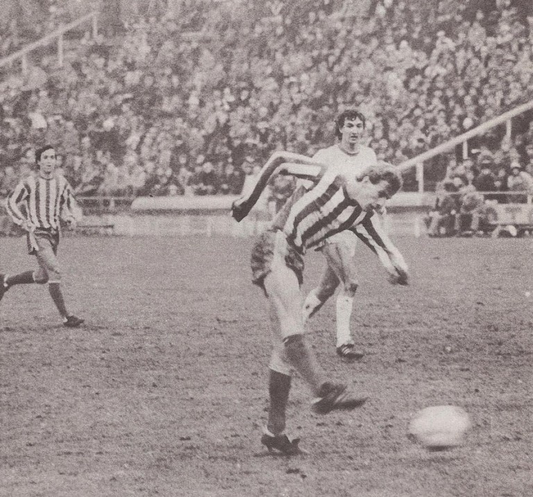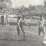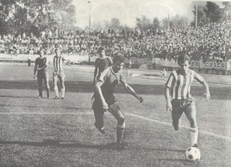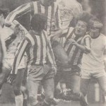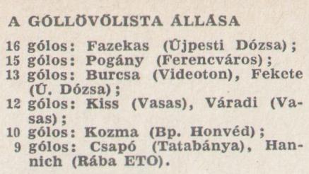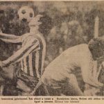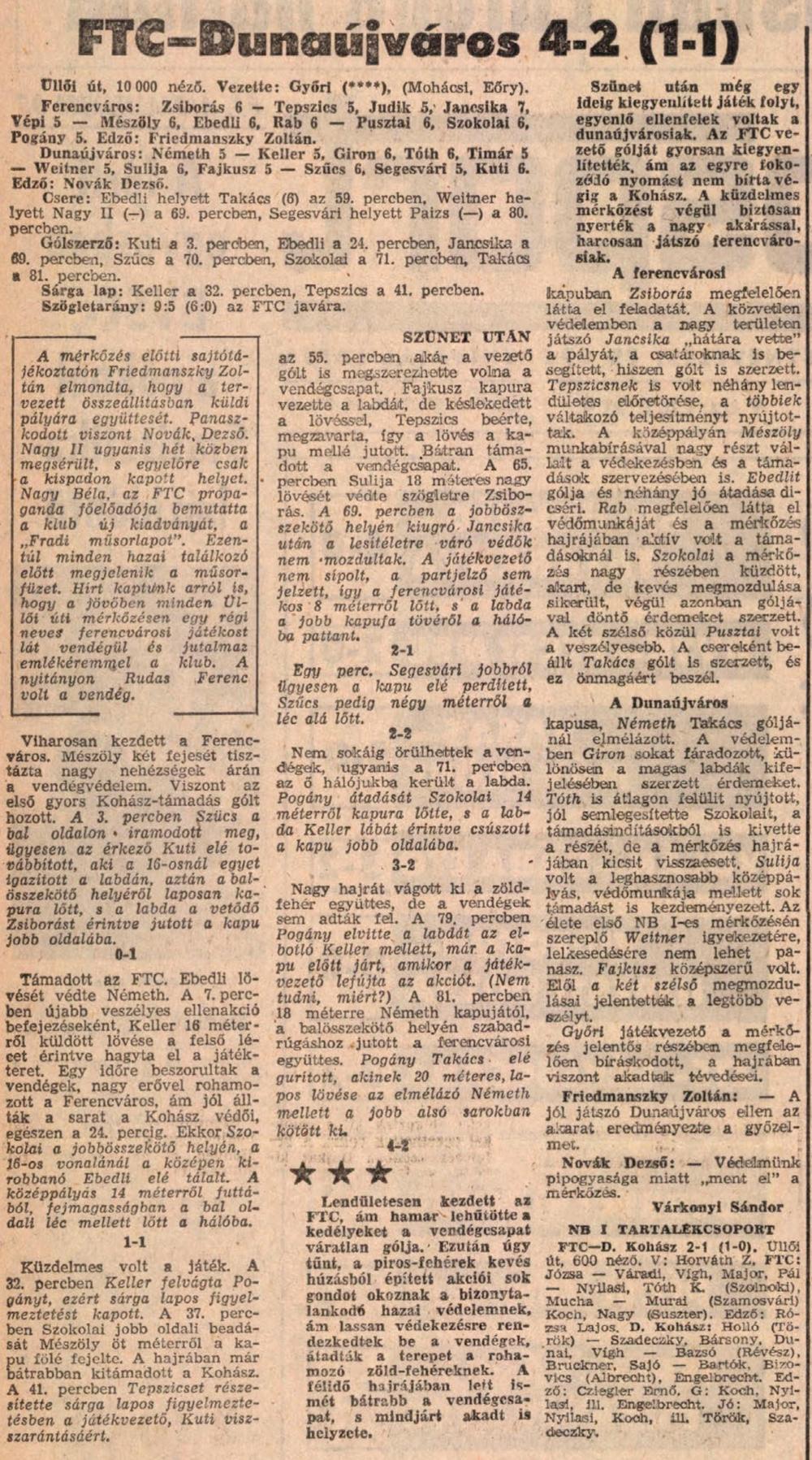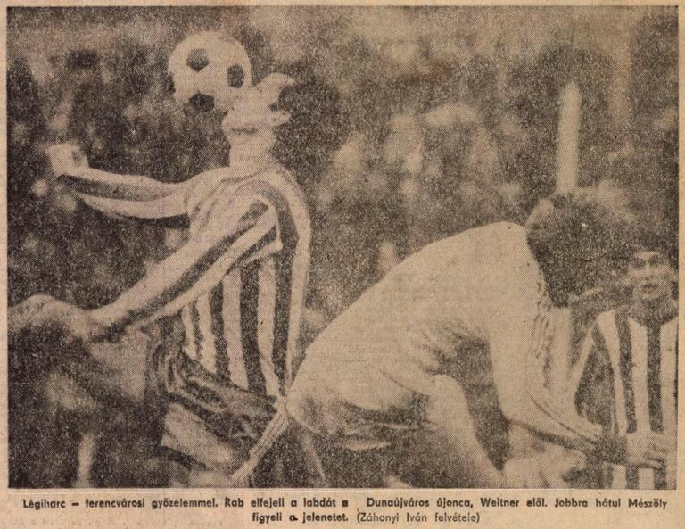 Tízezer néző előtt izgalmas, végig szoros mérkőzést játszott a két csapat. Képünkön Mészöly és Giron fejpárbajából ezúttal Giron kerül ki győztesen, Ebedli „szorult helyzetben”. A gólokat Ebedli, Jancsika, Szokolai és Takács, a dunaújvárosiakét Kuti és Szűcs szerezte.