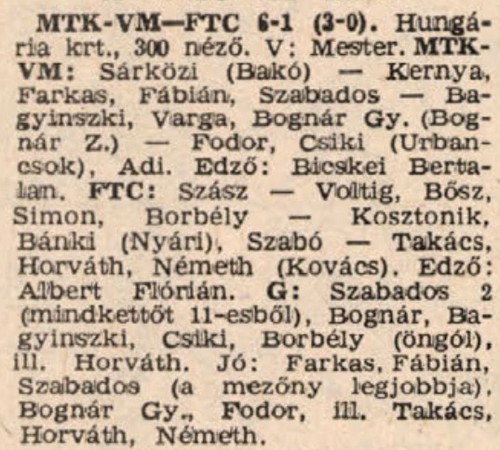 Az első mérkőzésen, az FTC— MTK-VM örökrangadón mindenki a zöld-fehéreket tartotta esélyesebbnek. Az MTK-VM-nek isimét a „lesipuskás” szerep jutott, eddig ugyanis esélytelenül is meglepően jól szerepeltek a Népstadionban a kék-fehérek. Szombaton azonban határozottan balszerencséjük volt, mert Gáspár után másik kiváló kapuvédőjük, Brünyi Béla is megsérült. Hiába küszködött hősiesen a fájdalommal, idő előtt el kellett hagynia a pályát, és a kétségtelenül tehetséges, de még tapasztalatlan újonc, Pleskó két olyan gólt is kapott, amelyet Brünyi minden bizonnyal hárított volna.