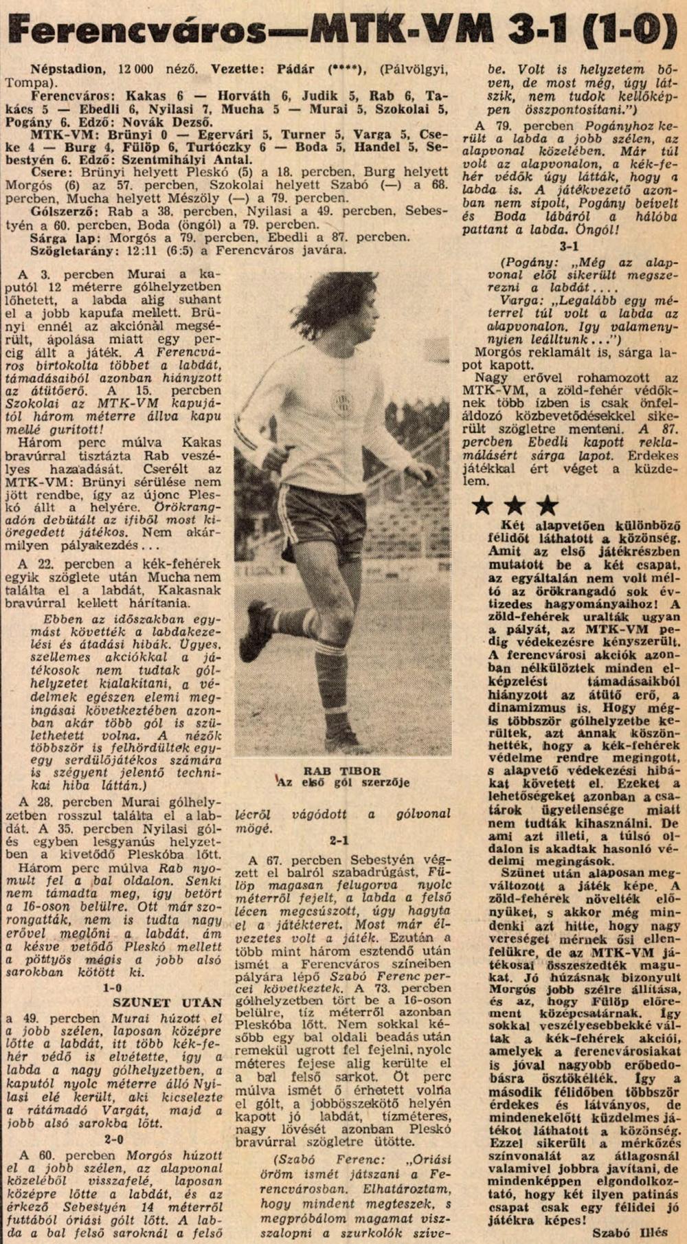 Rab, Nyilasi majd Sebestyén lőtt gólt, és akkor az MTK-VM az egyenlítésért küzdött. Nem sokáig, mert a zöld-fehérek növelték előnyüket egy vitatott góllal, amely szerintünk szabályos körülmények között esett, ugyanis a labda nem hagyta el a játékteret az akció közben. Végül Pogány belőtte a kapu elé a labdát és az Bodáról bepattant. A találkozót 10 ezer néző látta. Pádár játékvezető nem követett el különösebb hibát. Morgós és Ebedli sárga lapot kapott.