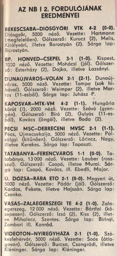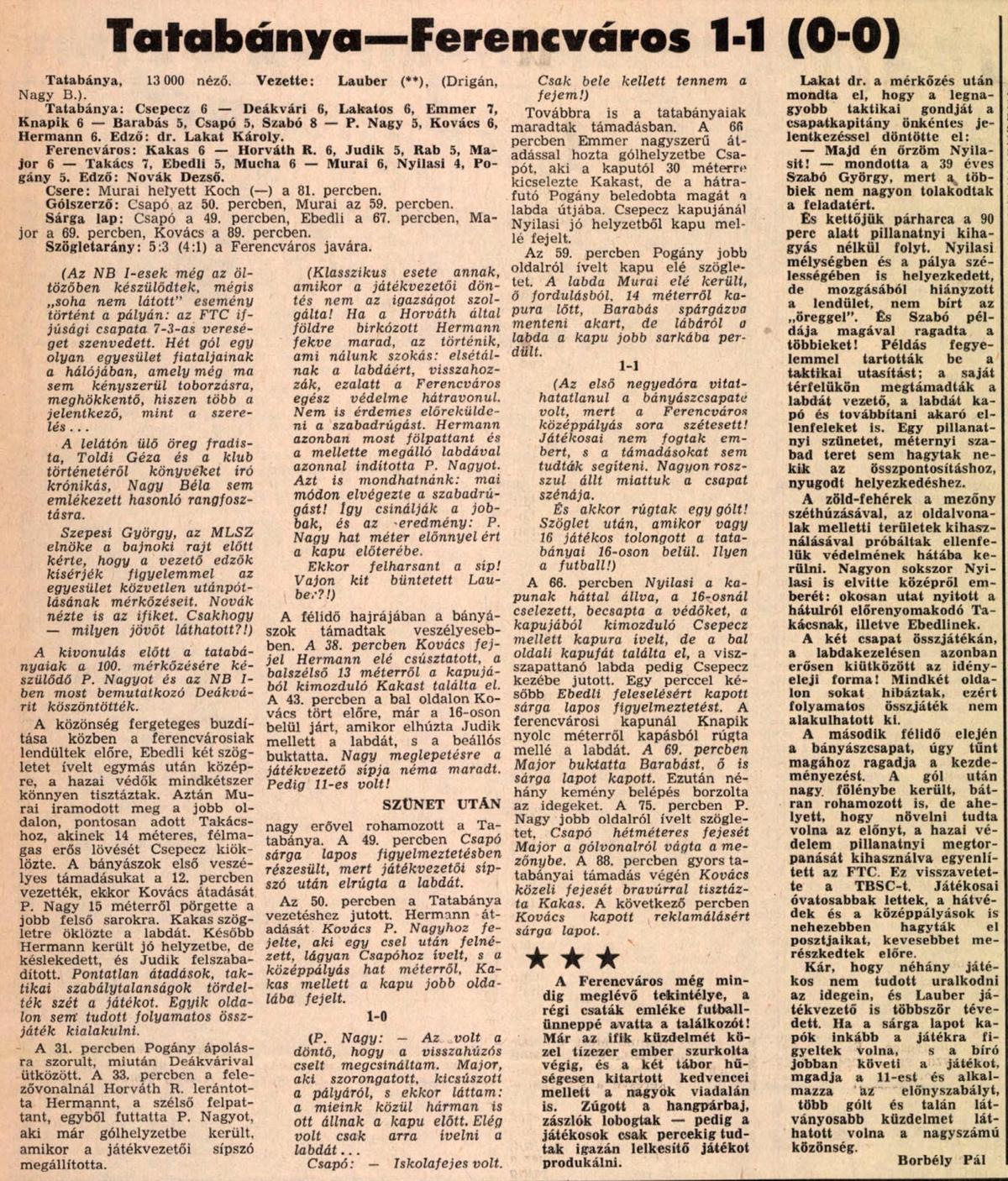 Nagyon sokszor Nyilasi is elvitte középről emberét: okosan utat nyitott a hátulról előrenyomakodó Takácsnak, illetve Ebedlinek. A két csapat összjátékán, a labdakezelésen azonban erősen kiütközött az idényeleji forma. Mindkét oldalon sokat hibáztak, ezért folyamatos összjáték nem alakulhatott ki. A bányászcsapat a második félidő elején magához ragadta a kezdeményezést. A gól után nagy fölénybe került, bátran rohamozott is, de előnyét növelni nem tudta.