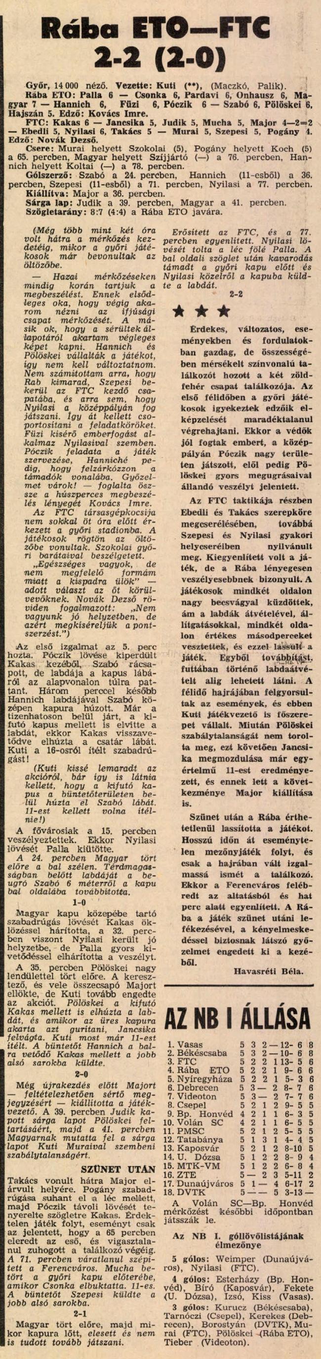 Erősített az FTC és a 77. percben sikerült is az egyenlítés. Nyilasi lövését a léc fölé tolta Palla, így szögletrúgás következett. A beívelt labdából kavarodás támadt a győri kapu előtt és Nyilasi közelről a kapuba küldte a labdát, 2:2.