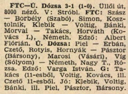 FTC: Kakas – Jancsika, Judik, Rab, Takács – Szepesi, Nyilasi, Ebeldi – Szokolai, Szabó, Pogány