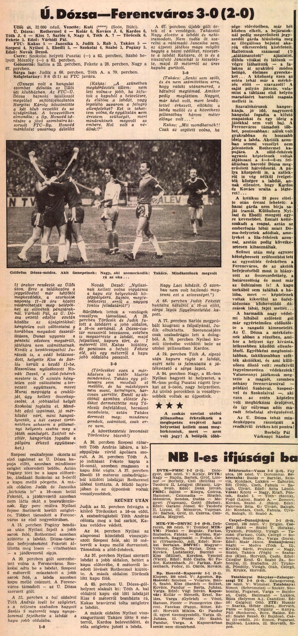 A várakozásnak megfelelően nagy sebességgel kezdte az Üllői úti rangadón a hazai csapat a játékot. Néhányszor sikerült a széleken az újpesti védelem mögé kerülniük a zöld- fehéreknek, és a beadásokból, a beívelésekből, szögletrúgások alkalmával veszélyes helyzeteket teremteniük. Nyilasi előtt is, Szepesi előtt is több gólhelyzet is kialakult, de fejeseiket nem kísérte szerencse. Hol Rothermel védett jól, hol beleakadt valamelyik újpesti védőbe a labda, hol pedig csak néhány centiméteren múlt a ferencvárosi gólszerzés.