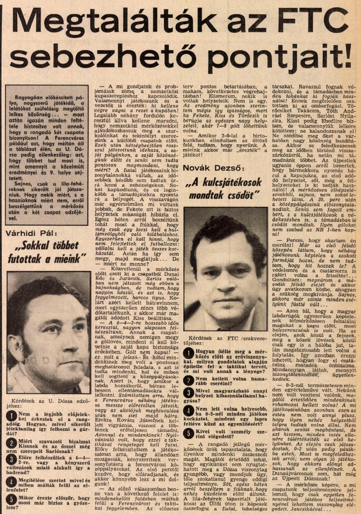 Szinte hihetetlen, de legjobb csapatainknál sokkal jelentősebben érvényesülnek bizonyos káros pszichikai tényezők, mint amint az elvárható lenne. A ferencvárosiak ugyanis a kétgólos hátrányban már nem küzdöttek olyan elszántsággal, mint annak előtte. Támadgattak, de kevés meggyőződéssel. Ennek nem is lehetett más eredménye, mint egy ilyen nagy gólkülönbségű vereség. Sőt, ha az újpestiek kihasználják gólhelyzeteiket, akkor…
