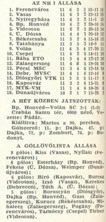 A többi pályán történtek közül ki kell emelnünk a Videoton elsöprő győzelmét a volánosok fölött. A jelek szerint a Volánnak a jó kezdés után átmeneti nehézségekkel kell megküzdenie. Értékes döntetlent ért el a Nyíregyháza Győrben, a Pécsi MSC Diósgyőrött. A kaposváriak erejükön felül teljesítettek Kispesten, mégis vesztesként kellett elhagyniuk a pályát. A Vasas magabiztos győzelmet aratott, és ezzel pontszámban utolérte a listavezetőt. Az MTK-VM újabb vereségével rendkívül nehéz helyzetbe került, a folytatás a szerdai kupanap után, szombaton és vasárnap, mint arról másutt beszámolunk …