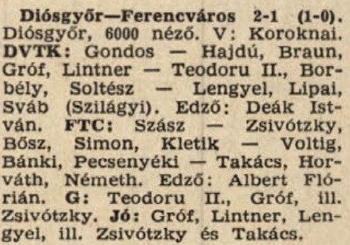 A Ferencvárosnak még a téli időszakban is vonzereje van … Ezt bizonyította, hogy Diósgyőrben is szépszámú közönség látogatott ki a zöld—fehérek elleni mérkőzésre. A pálya talajáról nem sok jót lehet elmondani, inkább jégkorong mérkőzés lejátszására lett volna alkalmas, mint labdarúgásra. Viszont ezen a talajon érvényesülni kellett volna a technikai tudásnak. A két csapat játékosai, ha nem is jelesre, de úgy jó közepesre vizsgáztak technikából, mert miközben igyekeztek megszelídíteni a labdát, dolgukat alaposan megnehezítette, hogy arra is kellett figyelniük, ne csússzanak el.