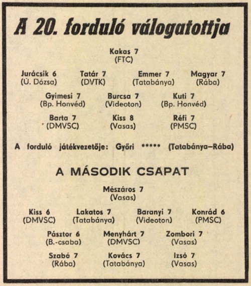 FTC: Kakas — Jancsika, Judik, Mucha, Takács — Ebedli, Nyilasi, Mészöly—Murai, Szokolai, Pogány