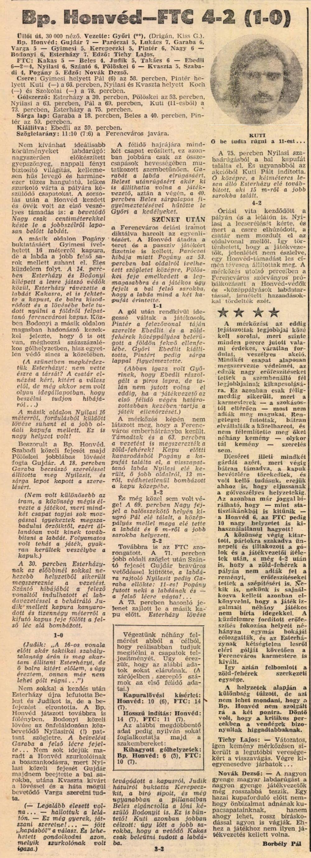 A második félidőben fokozódik az iram, folytatódik a heves küzdelem. Pölöskei egyenlítő gólja után izzóvá válik az amúgy is vibráló légkör, játéktéren és nézőtéren egyaránt forrósodik a hangulat. A pályán ez kemény összecsapásokban, szabálytalankodásokban is megnyilvánul olykor, nem vitás azonban, hogy roppant érdekes, izgalmas, változatos a játék. Ebedli súlyos sportszerűtlensége (belerúg az őt szerelő s már földön fekvő Pintérbe) behozhatatlan hátrányba hozza a hazaiakat, noha Nyilasi a kiállítás után megszerzi a vezetést a Fradinak. A piros-fehérek hamar egyenlítenek, majd a mérkőzés második fordulópontja következik (az első, szerintünk, éppen Ebedli kiállítása volt): a biztos 11-es rúgónak ismert Pogány a büntetőből a felső lécre lövi a labdát. (A foci íratlan törvényei szerint ez nagyobb hiba, mintha fél méterrel mellé rúgta volna.) Aztán Kuti megmutatja, hogyan kell érvényesíteni a 11-est és máris 3-2-re vezet a Honvéd. A zöld-fehérek nem adják fel, de két perc múlva végleg eldől a mérkőzés. A rendkívül rossz napot kifogó Győri megadja Esterházy lesről lőtt gólját. (Ebben a partjelző is hibás.) Tombol a lelátó, vitatkoznak, reklamálnak a fradisták. A kettős csere sem segít, a rangadó két pontja a Bp. Honvédé.