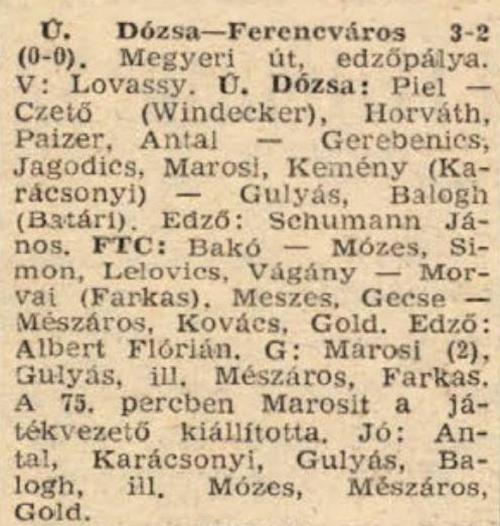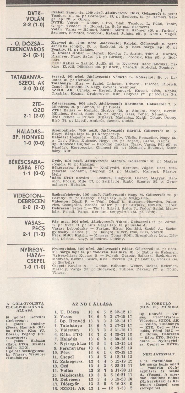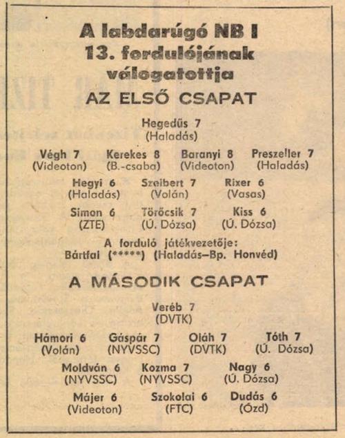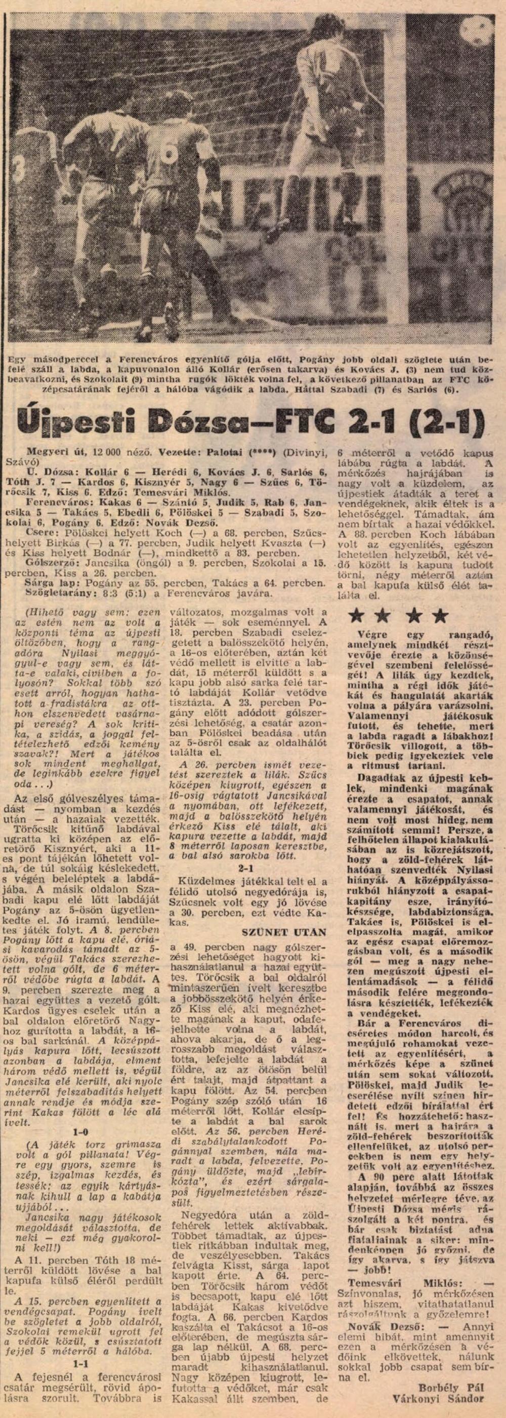 – Nos, ami a döntő mozzanatokat illeti, azokból, sajnos, volt jócskán, mint nemegyszer ezen az őszön. Kezdeném azzal, hogy a mérkőzés elején, 0-0-nál ott voltak a nagy gólhelyzetek, csak be kellett volna rúgni azokat. De nem … Takács is, Pogány is ott állt a kapu szájában, előttük a labda meg a nagy lehetőség, de hiányzott belőlük a határozottság. A Dózsa-kapunál kimaradtak a helyzetek, nálunk meg Jancsika öngólt rúgott. S mint ahogy a közmondás szól, a szegény embert az ág is húzza. Ha a mieinknek nem megy, akkor minden összejön.