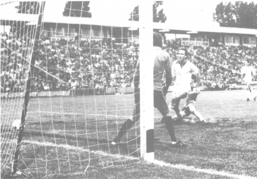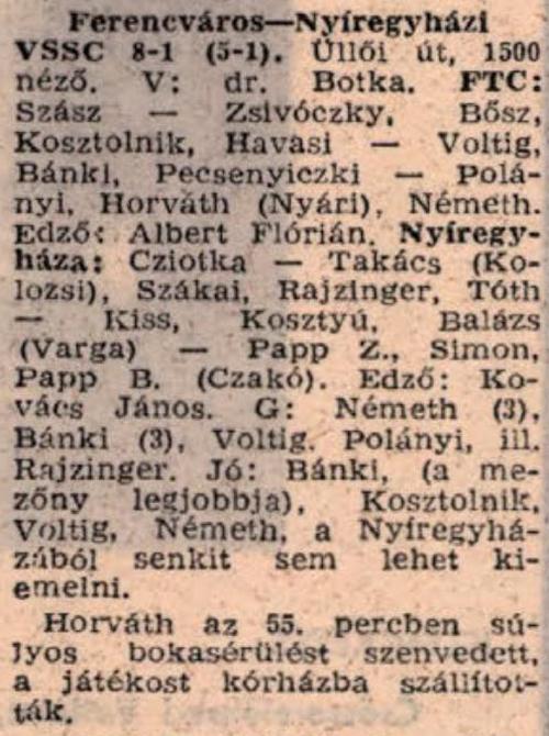 És győzelemmel ünnepelte. Az első félidő ugyan gólnélkül végződött, de érezni lehetett, hogy a meg-meg újuló ferencvárosi támadások előbb-utóbb góllal végződnek. Az 55. percben megtört a jég. Pogány nagy vágtával lefutott az alapvonalig, onnan átívelte a labdát — és a jókor érkező Nyilasi 8 m-ről a kapuba fejelte a labdát. És a közönség buzdításától kísérve egyre másra futottak a ferencvárosi támadások. A 62. percben Major húzót el, majd középre adta a labdát. Szokolai ügyesen továbbperdített s a nagy iramban érkező Nyilasi az ötösrő) a kapuba vágta a második gólt.