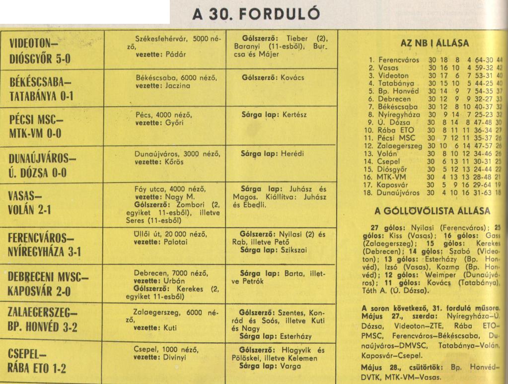 A fordulat a második félidőben következett be, gondolom Novák Dezső is felemelhette a hangját, vagy csak megtalálta a Nyíregyháza gyenge pontjait, hiszen Nyilasi Tibor két góljával elég gyorsan ünnepi karnevállá változott a Szentély. Rab góljával háromra nőtt az előny és bár a mérkőzés hajrájába szépített a Nyíregyháza, a csapat tovább robogott a bajnoki cím felé vezető úton.