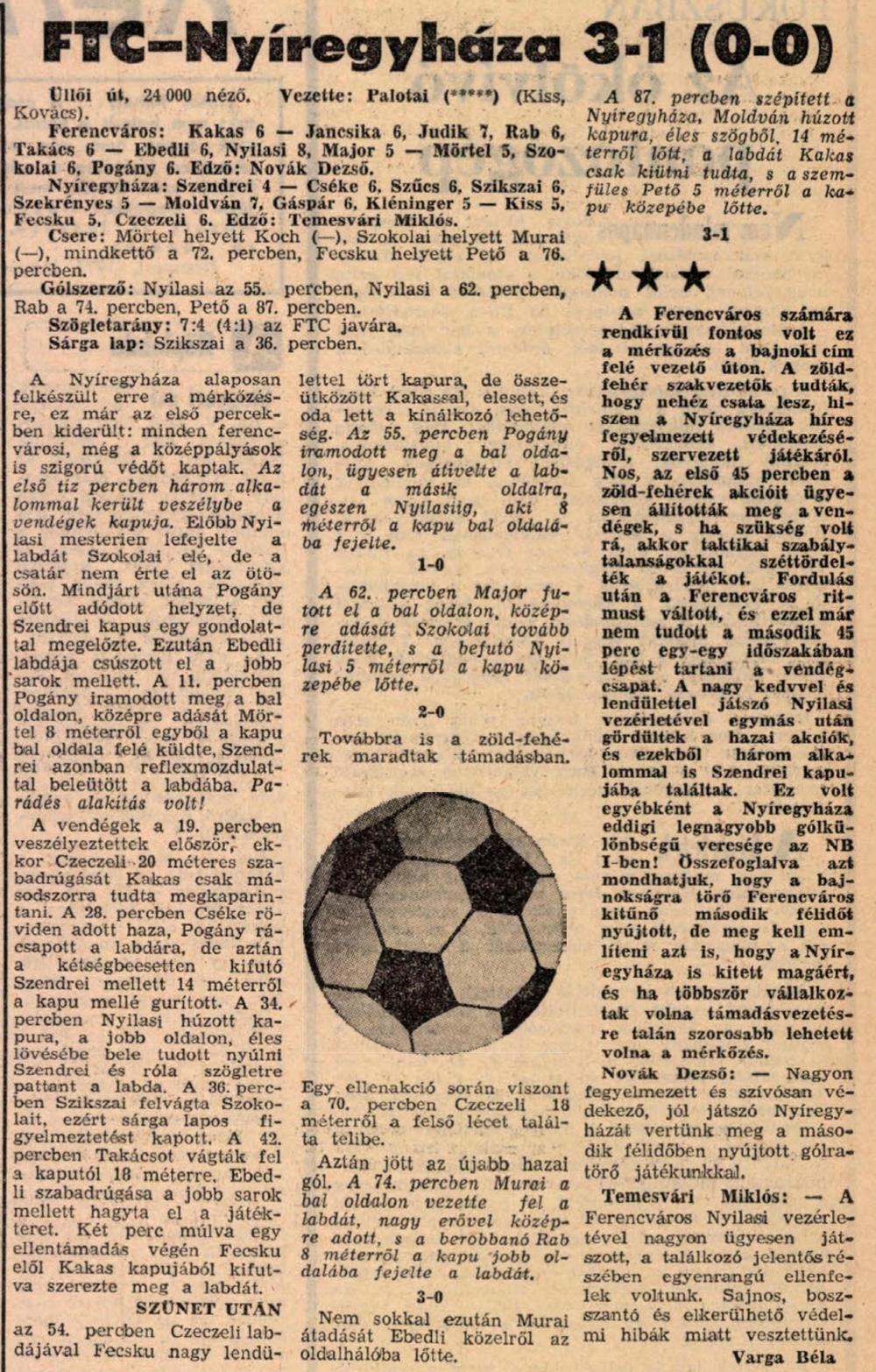 Harcos erényeket csillogtatott Nyíregyháza az Üllői úton, pedig a Ferencváros mintegy húszezer főnyi közönsége buzdította csapatát. A vidéki csapat azonban jól megszervezte védekezését és Szendrei kapus is jól védett, az első félidőben mindent hárítottak a vendégek, ezért nehéz második negyvenöt perc várt a bajnoki címre törő zöld-fehérekre. Hogy nehéz, az nem is kifejezés, ugyanis a második játékrészben egyszer, még 0-0-ás állásnál Fecsku ígéretesen és egyedül tört a hazai csapat kapujára, de Judik szabálytalankodásának és Kakas jó ütemű közbelépésének révén kimaradt a legnagyobb nyíregyházi gólhelyzet. És ekkor már látszott, csakis a gólkülönbség kérdéses, a hazai győzelem nem maradhat el.