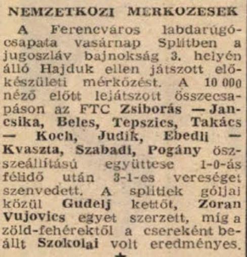 Splitbe utazott a Ferencváros. Ferencváros együttese szerdán 16 játékossal Jugoszláviába utazott. Az együttessel tart a bajaiak egyik tehetséges játékosa, Takács (szerk: József, 21 éves beállós, középpályás) is.
