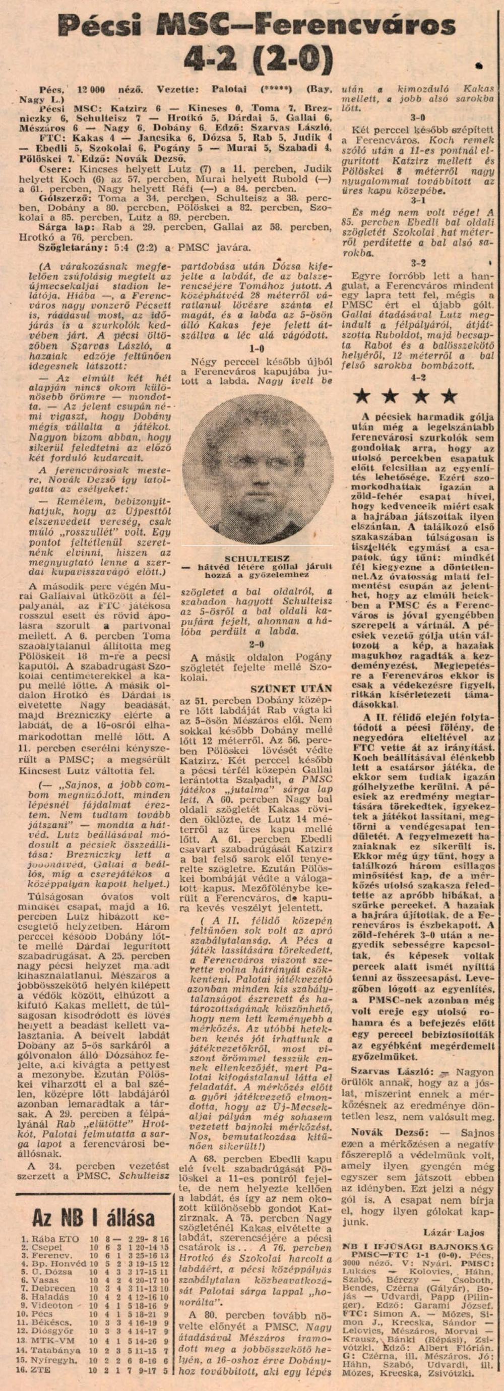 Sokan úgy gondolták Pécsett, hogy a PMSC-Ferencváros találkozón az elmúlt hetek kudarcai miatt mindkét csapat elfogadhatónak tartja majd a döntetlent. Szerencsére nem így történt, végig érdekes mérkőzésen -különösen a találkozó utolsó szakasza volt az – a pécsiek legyőzték az esélyesebb Ferencvárost. A hazai csapat 4 góllal terhelte meg a zöld-fehérek kapuját, és ebből a leglátványosabb az első, Toma gólja volt, aki 28 méterről talált a hálóba. A pécsi középhátvéd a mérkőzés után így elevenítette fel a találkozó 34. percét: