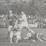 - (Képünkön Katzirz üti el a labdát Szokolal és Szabadi elől. PMSC—FTC 1-2. Arató László felvétele)
