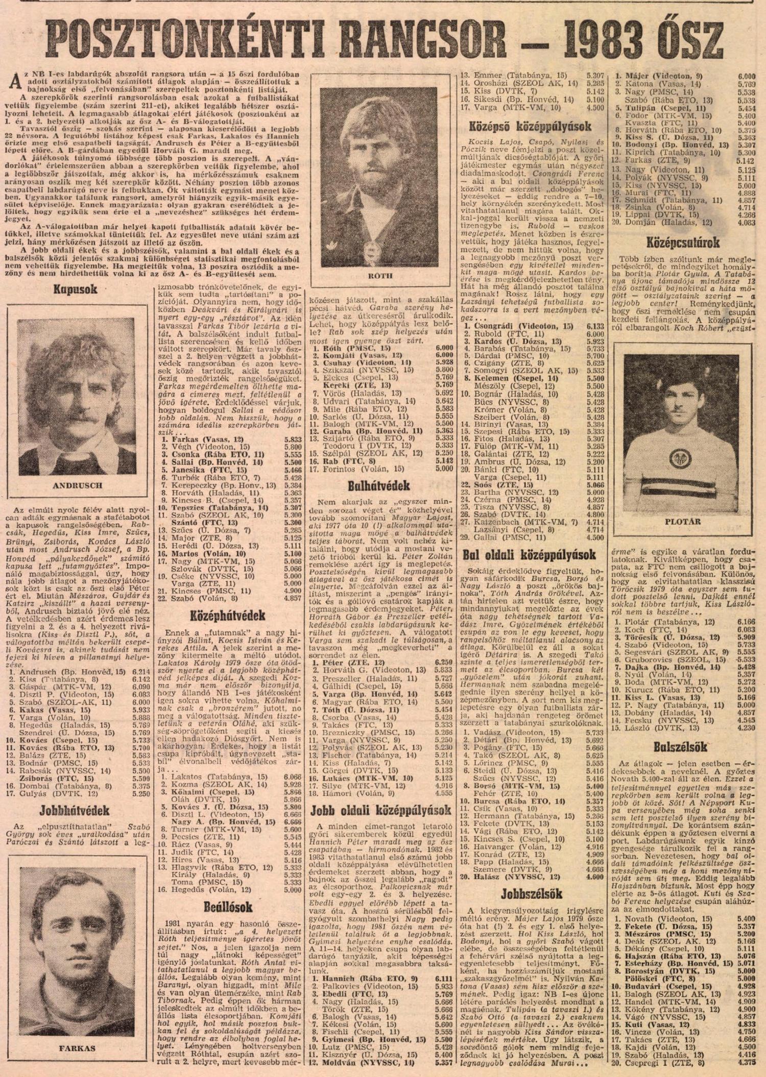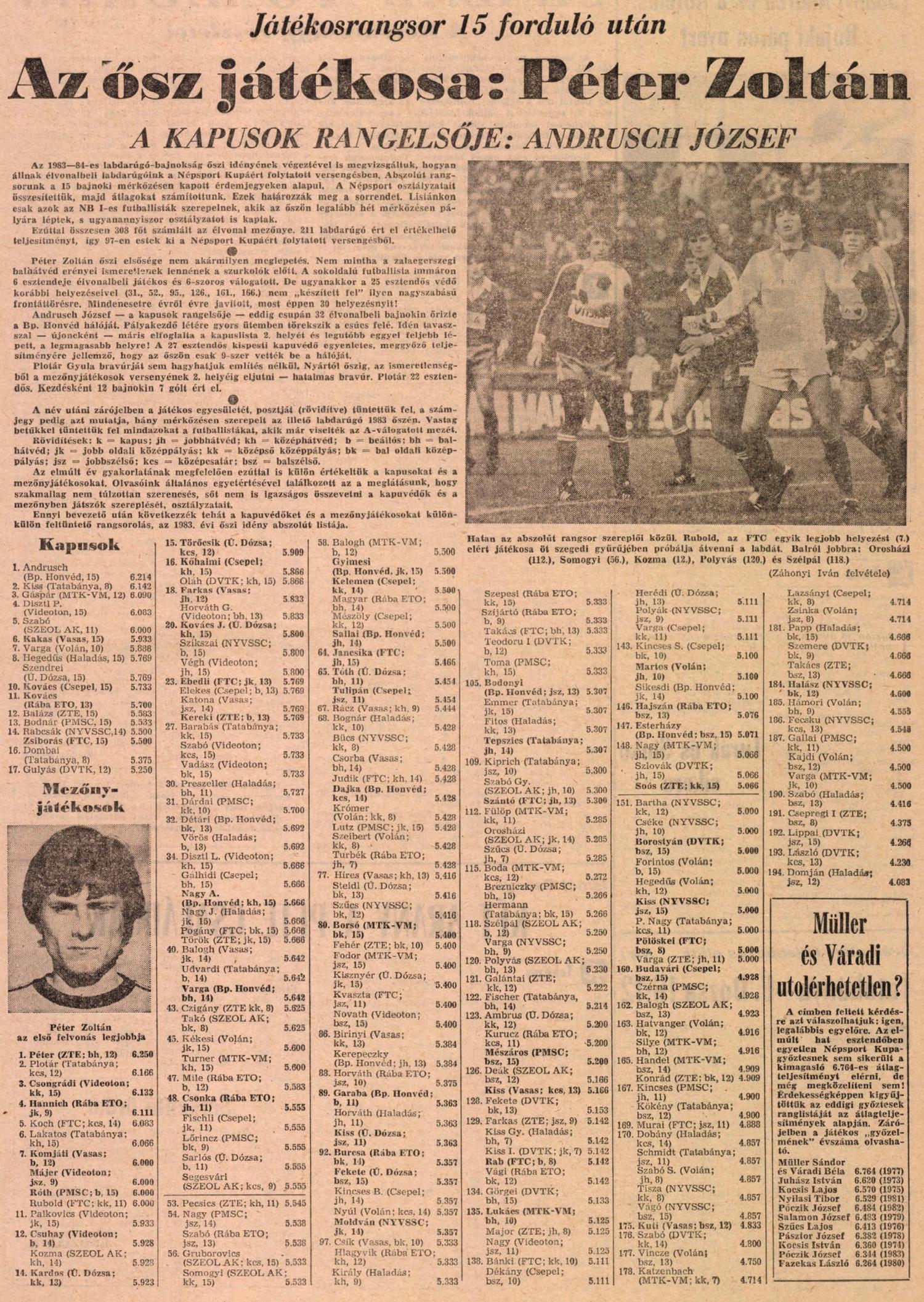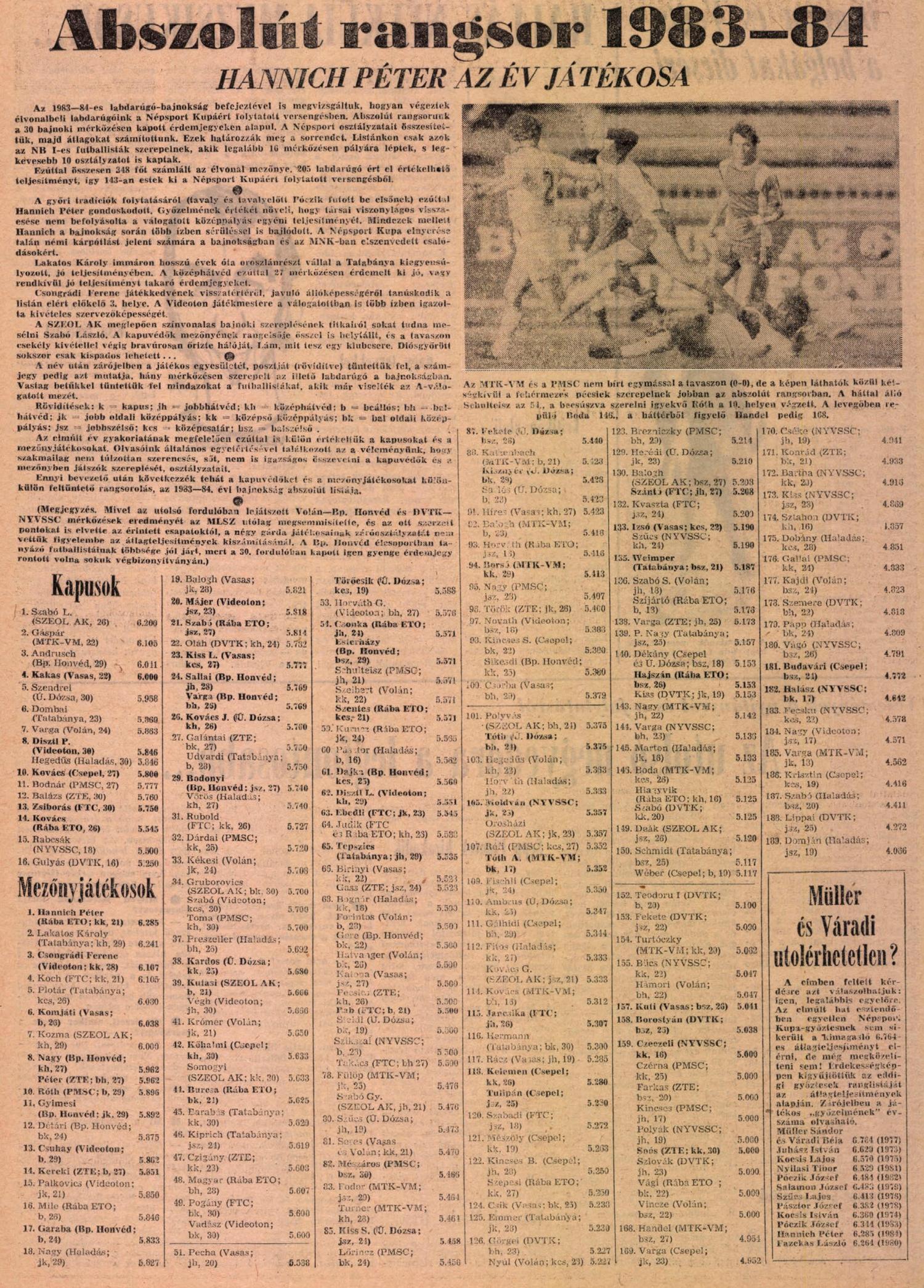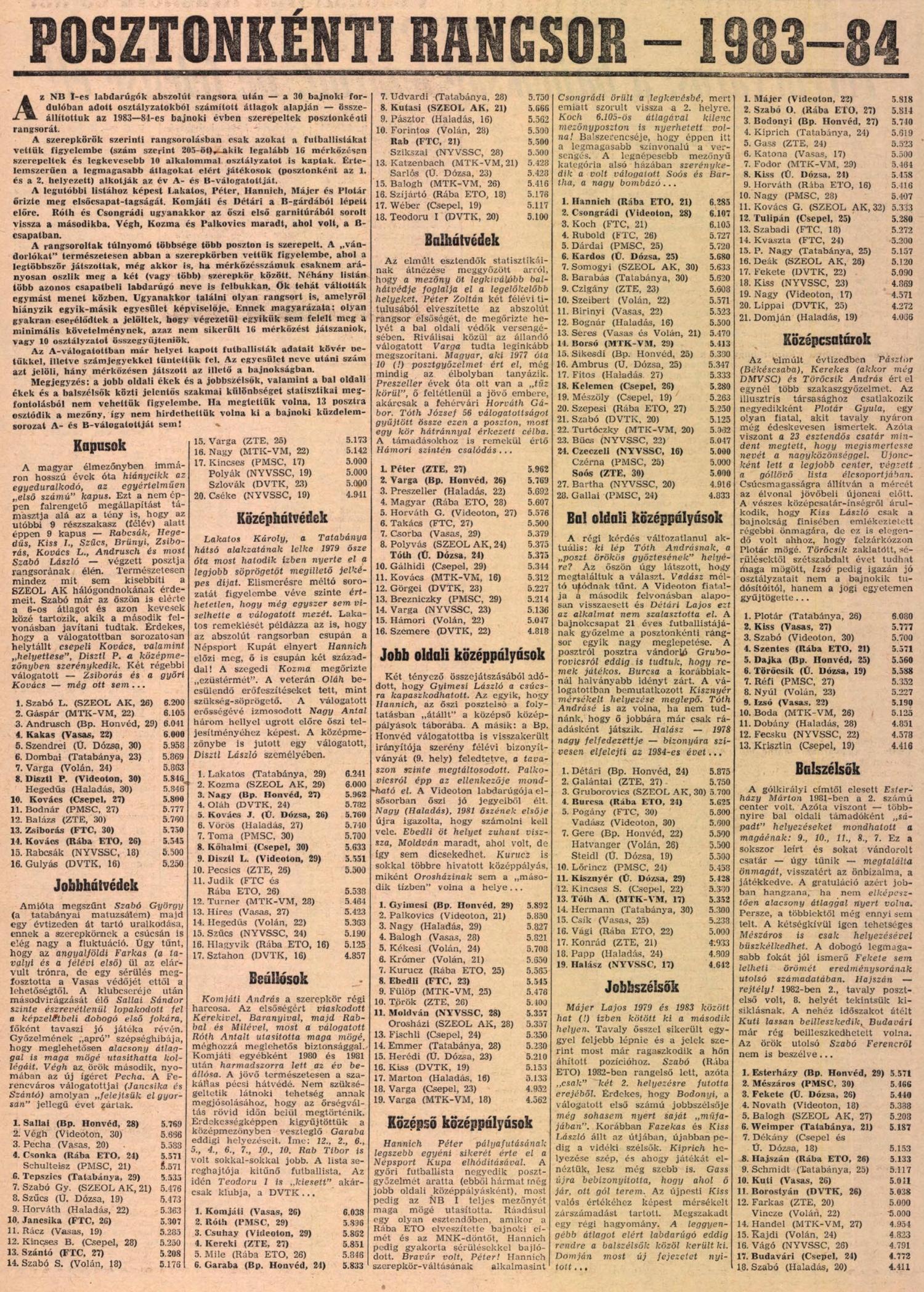 Kategória: Posztonkénti rangsor (NS) | Címke: 1983/84, Bánki József, Détári Lajos, Ebedli Zoltán, Esterházy Márton, Jancsika Károly, Judik Péter, Koch Róbert, Kvaszta Lajos, Murai Sándor, Pogány László, Pölöskei Gábor, posztonkénti rangsor, Rab Tibor, Rubold Péter, Szabadi László, Szántó Gábor, Takács László, Zsiborás Gábor