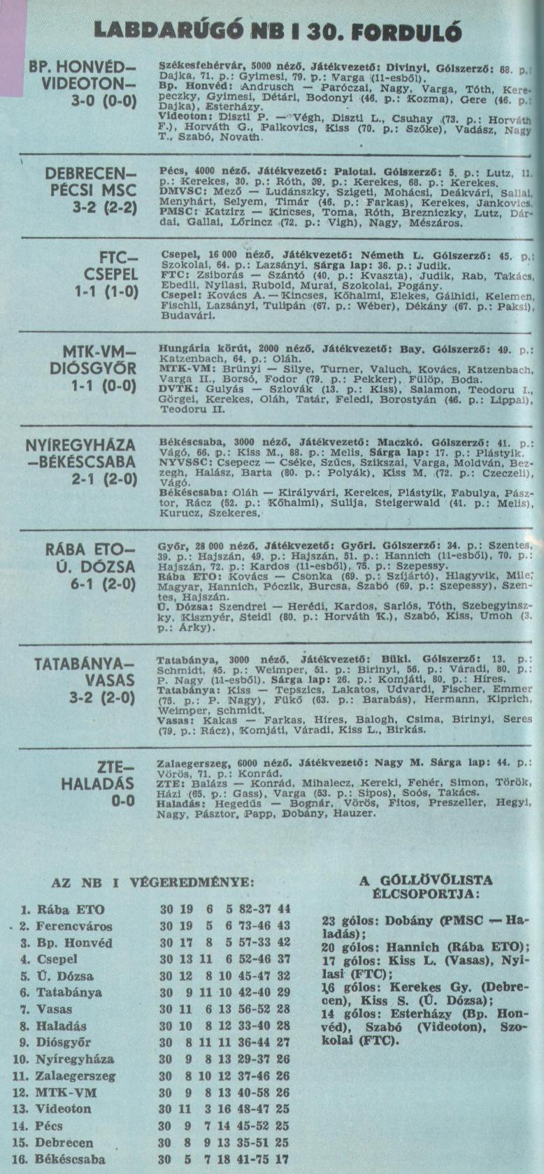 Abban talán már Novák Dezső tanítványai sem reménykedtek, hogy elmarad a győri fieszta. Nem is bírtunk az utolsó fordulóban a Csepellel, bár vezettünk 1:0-ra, de ahogy rádión érkeztek a győri mérkőzés góljai, a csapat úgy engedett le. 1:1 lett a vége, ráadásul ismét a Verebes alakulat nyert előttünk, bár az előző bajnokságban 5 pontos volt a különbség, 1982/83-ban meg csak egy, de azokban az időkben ennek a második helynek nem nagyon tudtunk örülni. Utólag persze már másként vélekedünk, hiszen a következő évek a ferencvárosi labdarúgás „vesszőfutását” hozták és sok-sok évnek kellett eltelnie ahhoz, hogy újból bajnoki címet ünnepelhessünk. Mely bajnoki cím Nyilasi Tibor nevéhez fűződik.