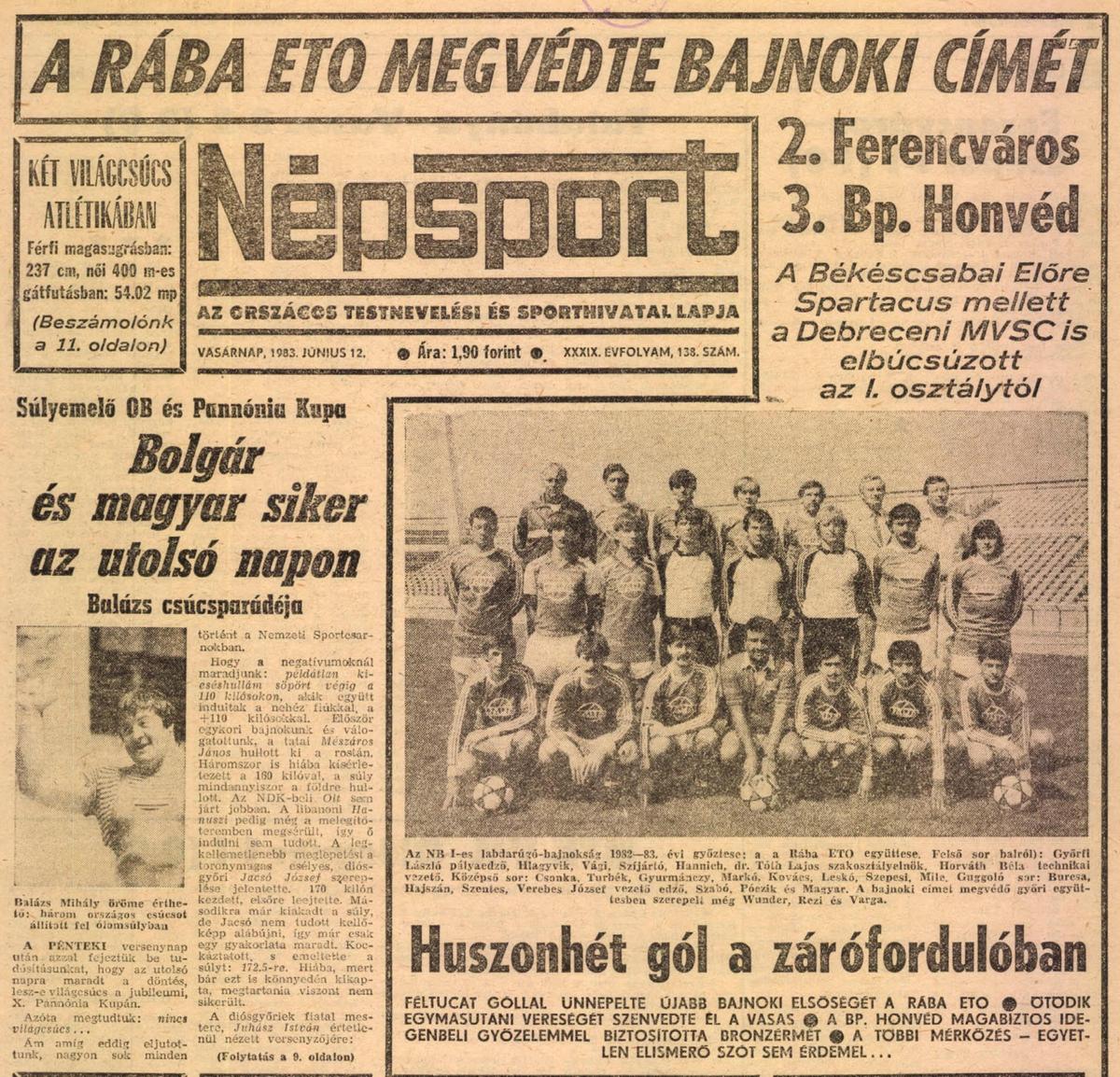 Amikor szembesültem a dátummal, akkor tárult fel igazán az emlékek tárháza. Közelmúltunk egyik legizgalmasabb és legszínvonalasabb bajnokságát vesztettünk el a Verebes József által dirigált győriekkel szemben. Akik látták az 1983. május 22-i, mindent eldöntő Rába ETO-Ferencváros rangadót, azok valószínűleg soha nem felejtik el. Nem csak amiatt, mert az akkori híradások az évtized meccsének titulálták és a 3:3-as döntetlen végül is a hazaiak bajnokságát jelentette, hanem Nyilasi Tibor mesterhármasa is örökre belénk ivódott. Főleg az első gólja, melynél a félpályáról indulva fektetve el az egész győri védelmet majd hidegvérrel gurított a jobb alsó sarokba. Már vezettünk 2:0-ra, de a vége 3:3 lett, így maradt a Győr egypontos előnye. És bár a 29. fordulóban felcsillant a remény, hiszen a Honvéd 71. percig vezetett a Győr ellen, de a végén Szepessy egyenlíteni tudott, így a végső döntés az utolsó fordulóra maradt. Nekünk csak egy Győri vereség jelentette volna a végső diadalt, de az utolsó fordulóban hazai pályán kiütötték az Újpestet (6:1), így megvédték bajnoki címüket.