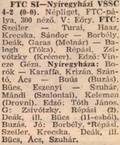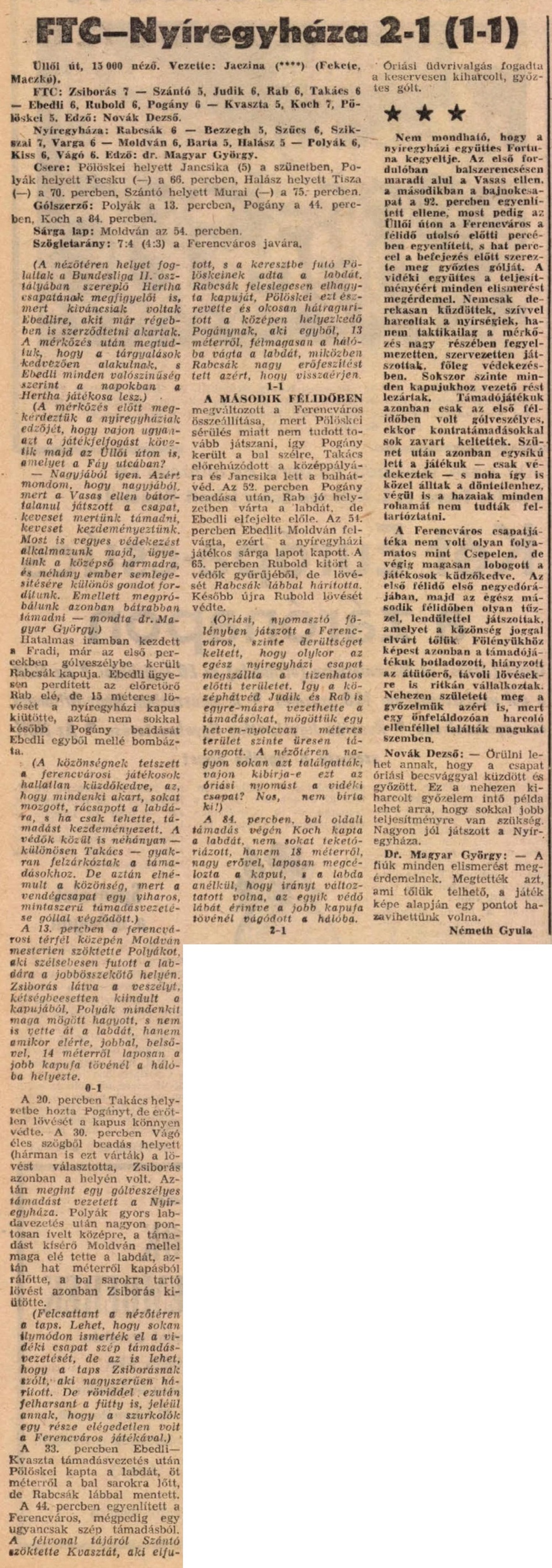 Óriási, nyomasztó fölényben játszott a Ferencváros, szinte derültséget keltett, hogy olykor az egész nyíregyházi csapat megszállta a tizenhatos előtti területet. Így a középhátvéd Judik és Rab is egyre-másra vezethette a támadásokat, mögöttük egy hetven-nyolcvan méteres terület szinte üresen tátongott. A nézőtéren nagyon sokan azt találgatták, vajon kibírja-e ezt az óriási nyomást a vidéke csapat? Nos, nem bírta ki.
