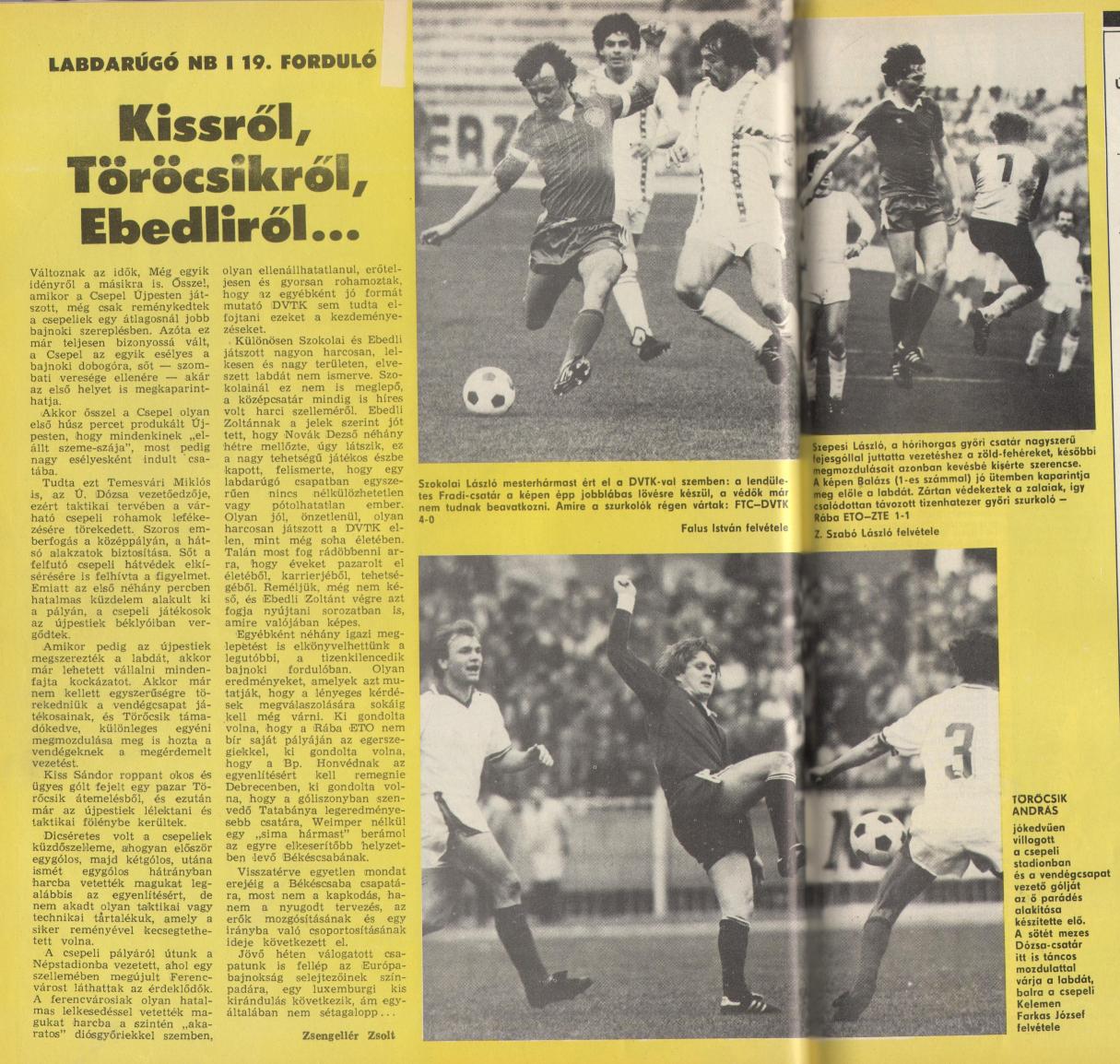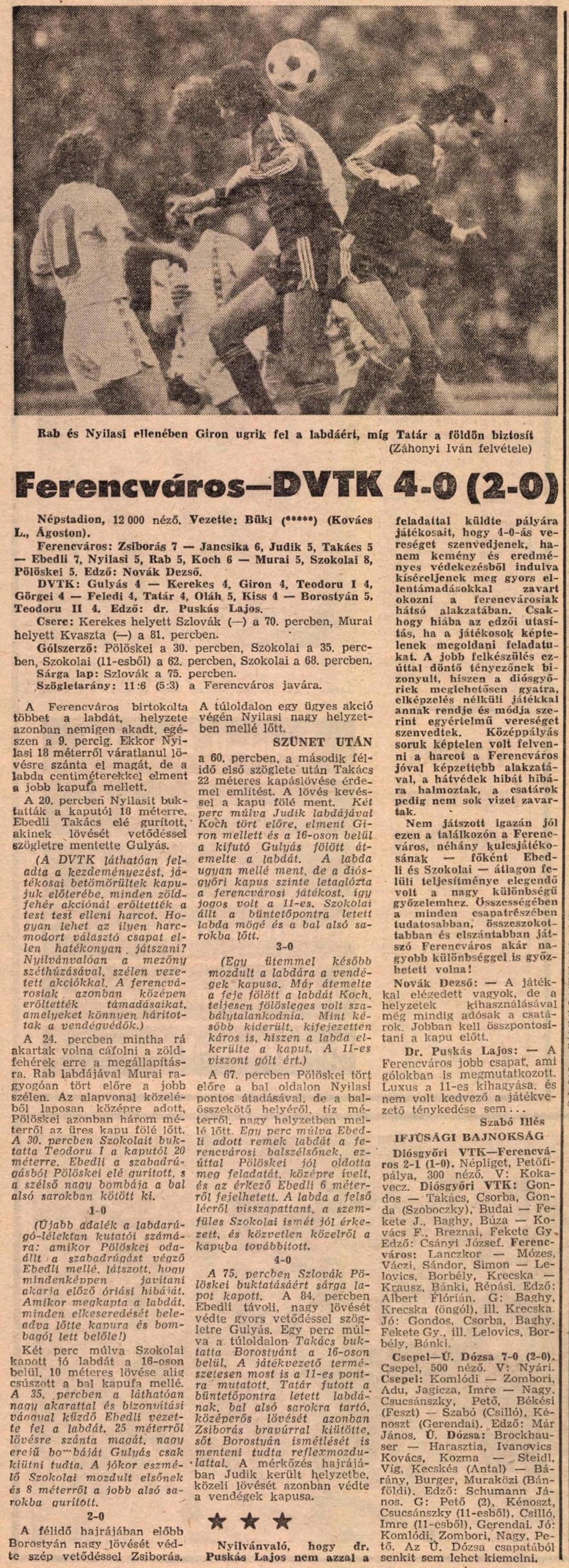 Akit viszont csak a foci és a Fradi érdekelt (biztos, hogy a jelenlévő 12 ezer szurkoló java része ilyen volt), az annak örülhetett láthatott négy szép gólt, köztük Szokolai mesterhármasát, láthatta Ebedli mértani pontosságú indításait, Zsiborás bravúros tizenegyes védését, és természetesen Koch Robi szellemes játékát, aki sokkal többre volt hivatott, de akit a folyamatos sérülések megakadályoztak abban, hogy igazi vezéregyénisége legyen a Ferencvárosnak.