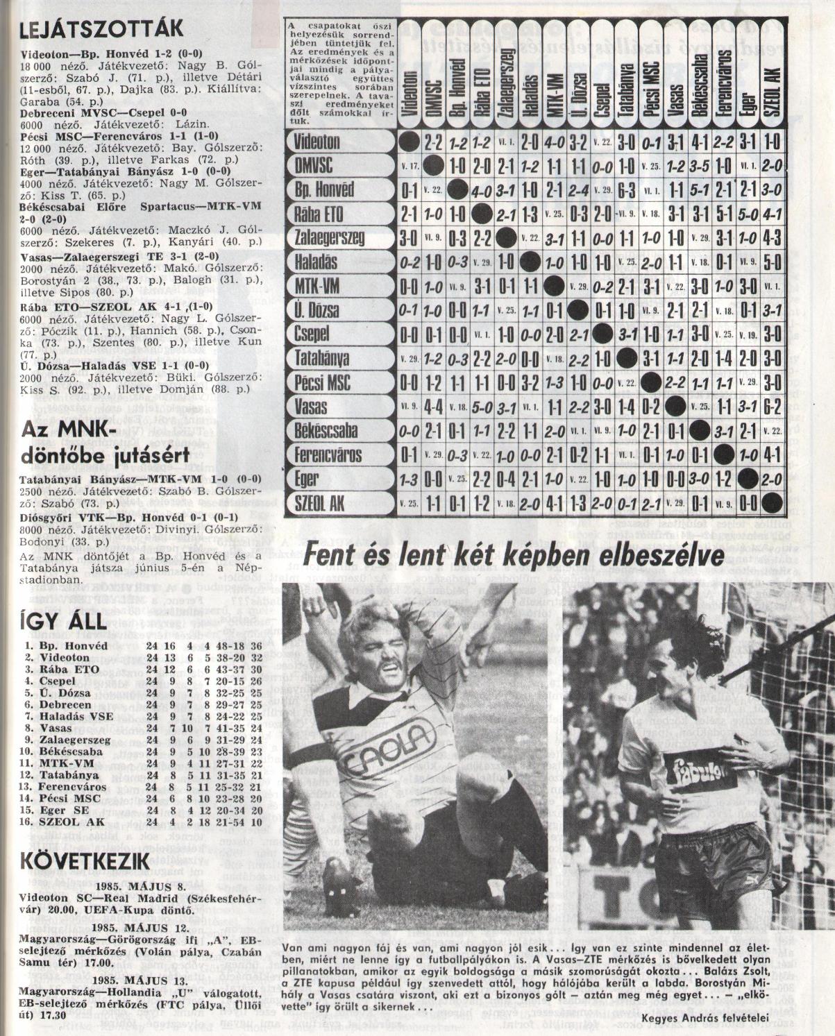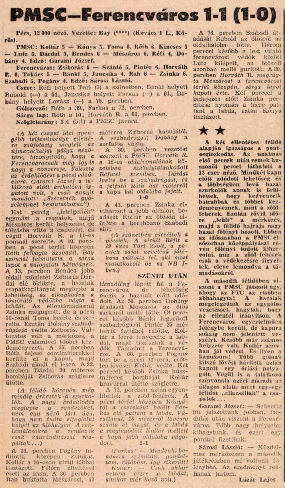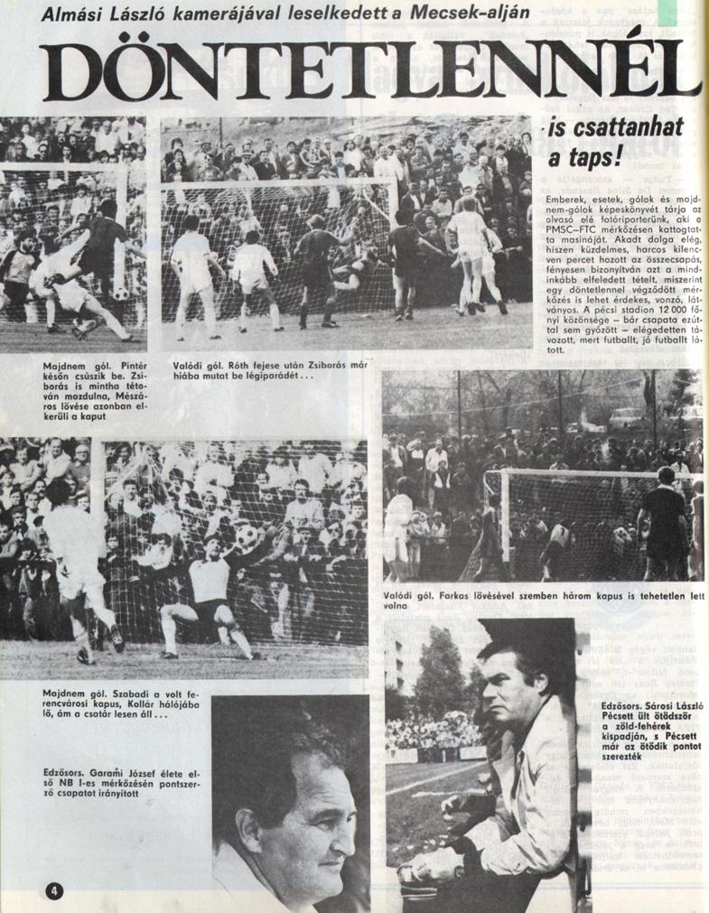 Sárosi Lászlónak 1985-ben a tűzoltás jutott, amit eredményesen teljesített. A pécsi döntetlen után négymérkőzéses jó sorozat következett, de még ez sem mentette meg attól az 1984/85-ös bajnokságot, hogy minden idők legrosszabb ferencvárosi helyezése legyen. Ettől függetlenül örök hálával tatozunk Sárosi Lászlónak, aki úgy vette át a karmesteri pálcán, hogy a csapat romokban hevert és mindenki tudta, hogy a megbízás csak a bajnokság végéig szól. Mégis teljesítette a rábízott feladatot és egy olyan együttest adott át Dalnoki Jenőnek mely a következő évben már csatlakozni tudott az élmezőnyhöz. Az 1985. május 4-i meccs ezen túl azért is emlékezetes, hiszen ekkor ült először élvonalbeli mérkőzés kispadján Garami József.