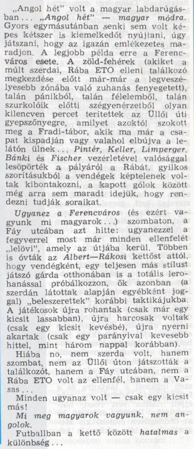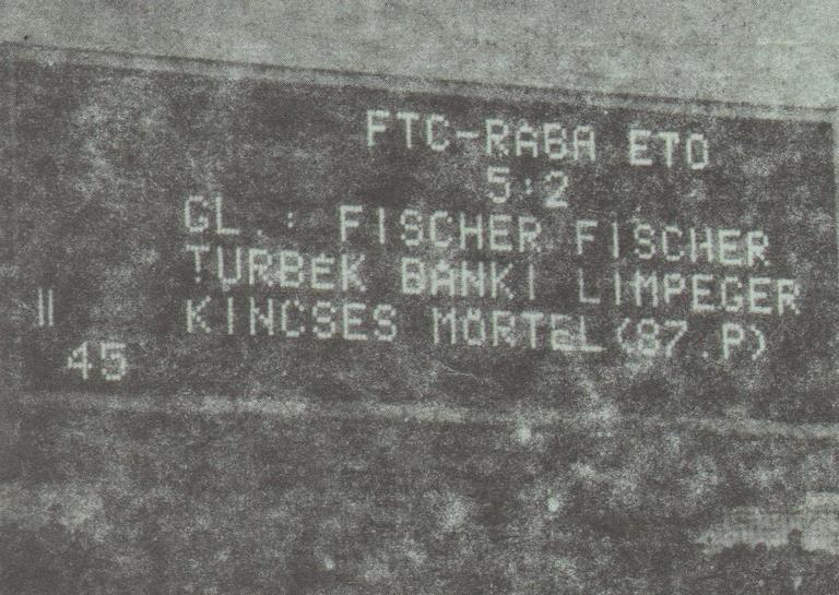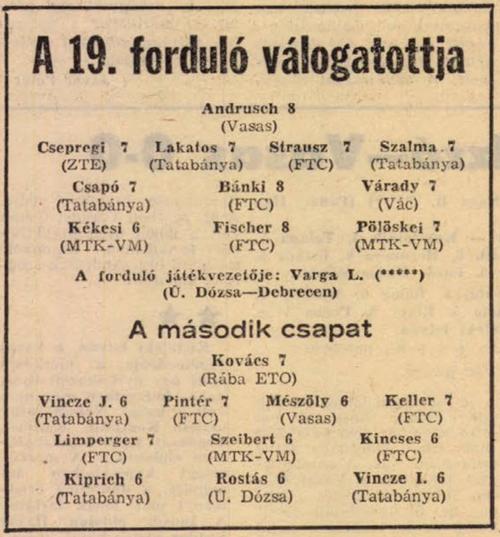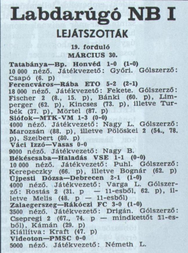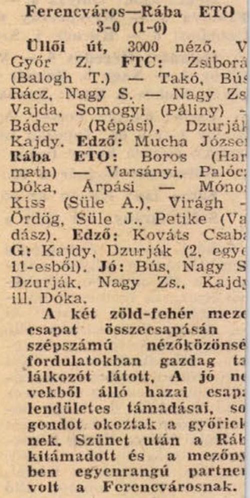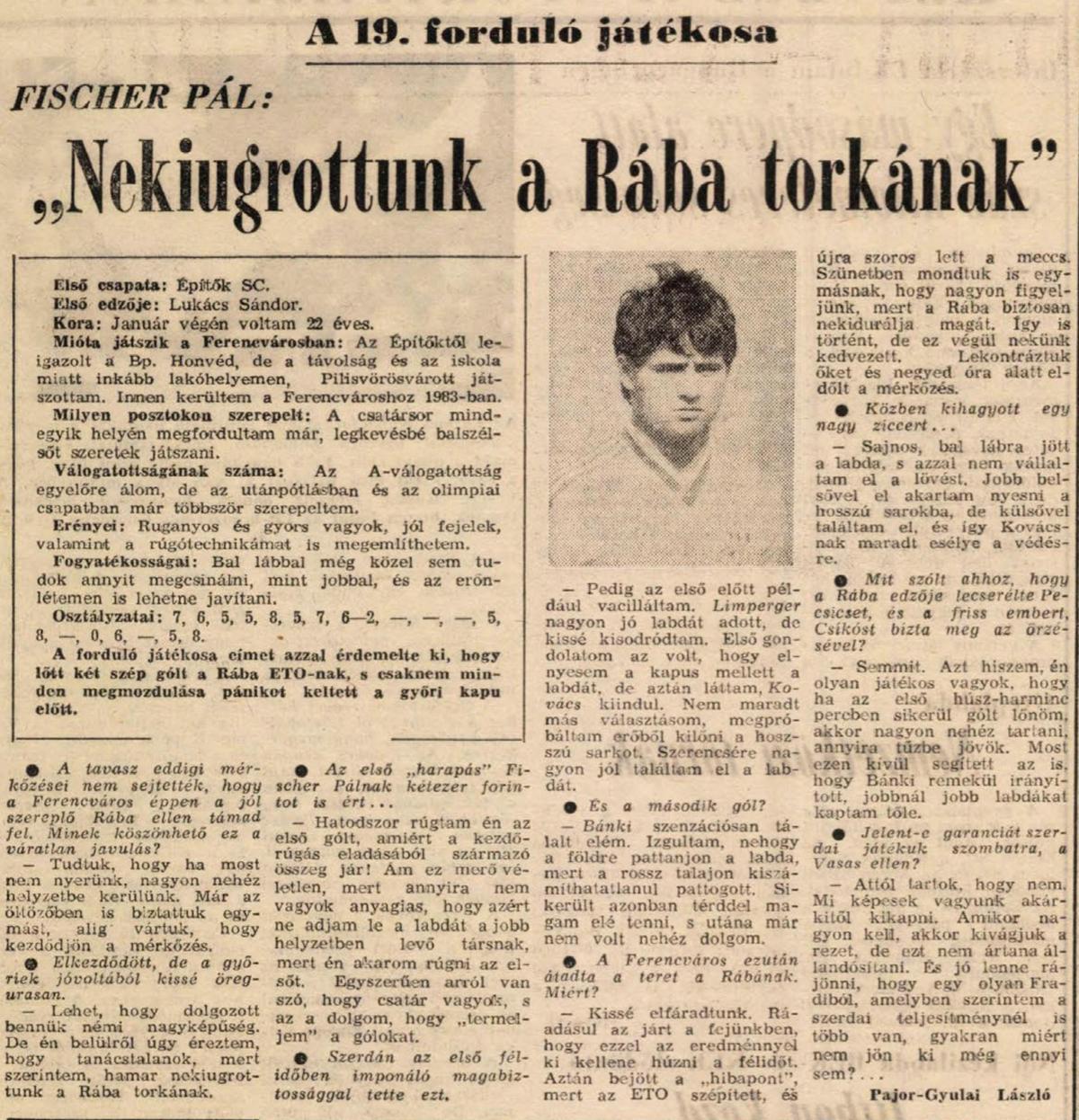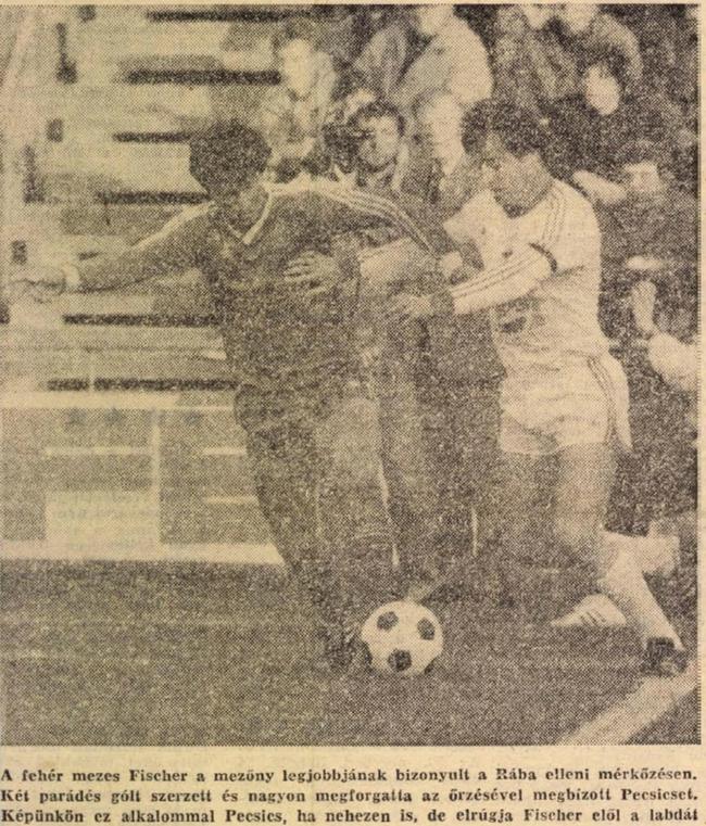 – Egyes vélemények szerint Fischer Pál volt a mezőny legjobbja. Két gólt lőtt, állandó zavart okozott a győri hátsó alakzatokban. Néhány nappal ezelőtt azért nem hivták meg az olimpiai válogatott keretbe, mert kifogásolták a munkához való hozzáállását.