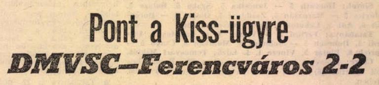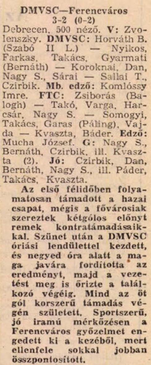 A pénteken este vezetőedzői állásából felmentett Kiss László helyett első alkalommal Vaczlavik Ferenc ült a DMVSC kispadján, aki korábban mint pályaedző dolgozott. Rendkívül jó talajú pályán DMVSC-rohamokkal kezdődött a mérkőzés, s a második percben Benyó már vezetést szerezhetett volna. A lest reklamáló védők közül egyedül kilépett, Józsa a 16-osig kifutott, s Benyó az elfekvő kapuvédőnek odagurította a labdát. Ezt követően Szűcs bombázott kapásból, utána pedig Bús mentett szögletre egy beadást. A Ferencváros első helyzete a 20. percben volt, Strausz szabadrúgása a kapu fölé szállt. A játék inkább a középpályán folyt, ritkán kerültek veszélybe a kapuk, akkor is rendszerint védelmi hibából.