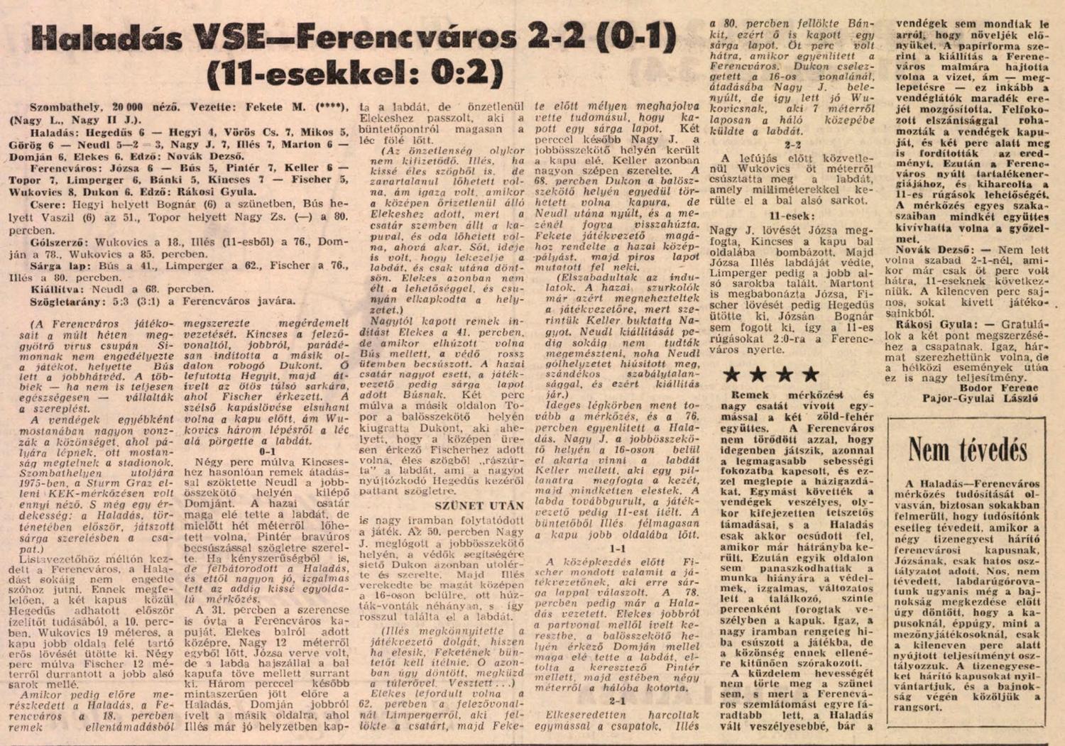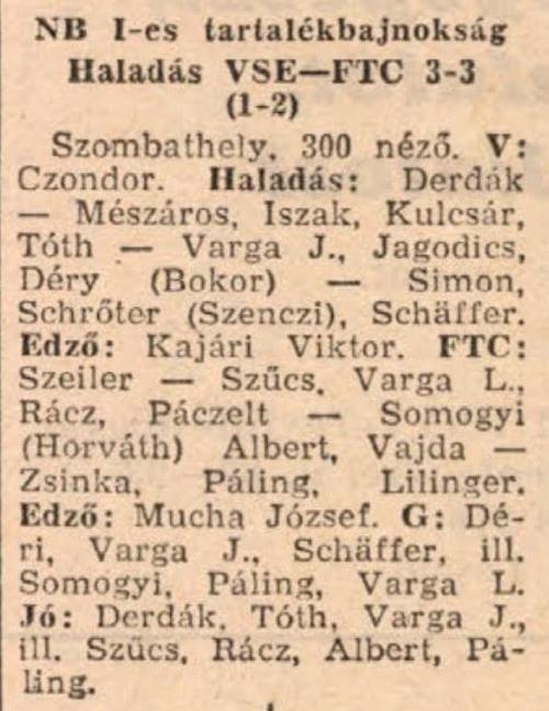 Haladás: Hegedüs – Hegyi (Bognár 46.), Vörös Cs., Mikos, Görög – Neudl, Illés, Marton – Domján, Nagy J., Elekes