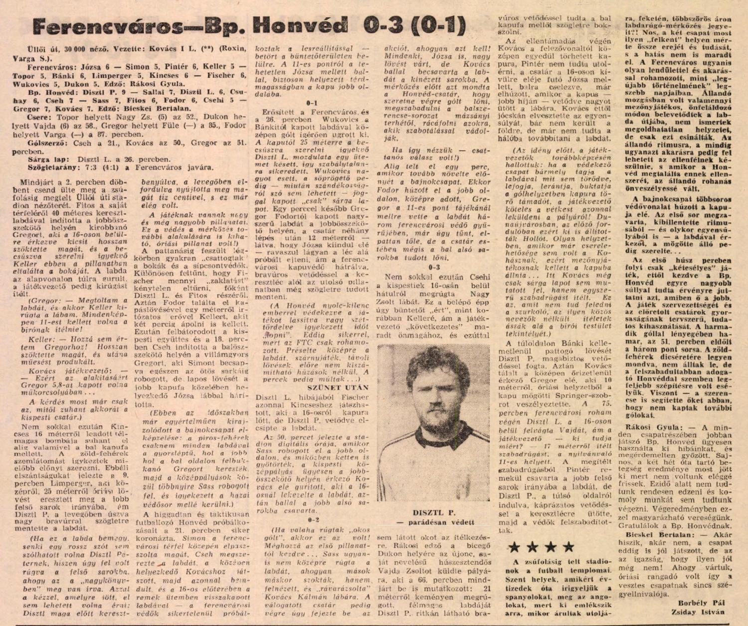 Bp. Honvéd: Disztl P. – Sallai, Disztl L., Csuhay, Cseh – Sass, Fitos, Fodor (Varga 87.), Csehi – Gregor (Füle 86.), Kovács