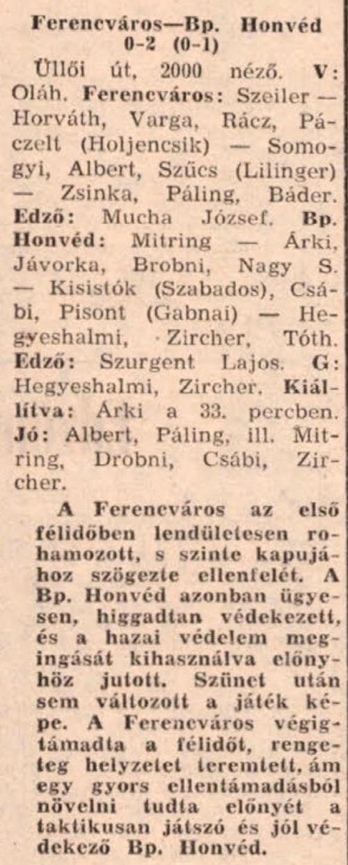 A forduló rangadójának kezdete előtt nem sokan fogadtak volna a Honvéd győzelmére, ami az előzmények alapján érthető is volt. Hazai pálya, 30.000 fanatikus szurkoló, fantasztikus idénykezdet, 11 elszánt labdarugó, mig a bajnok jelenleg a tabella alján tanyázik. Mégis megtörtént a „csoda” a piros-fehérek okosan játszottak, védőik magabiztosak voltak. Elől az uj szerzemény Gregor állandó veszélyt jelentett, mig a hazaiak leszegett fejjel, elképzelés nélkül rohamoztak. A zöld-fehérek még örülhettek is, hogy csak három gólt kaptak.