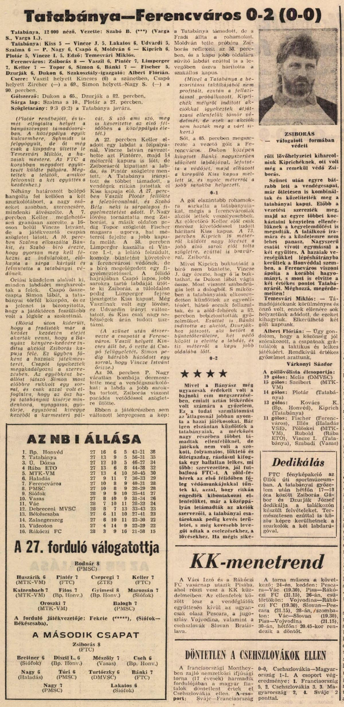 A nagy iramban kezdődött mérkőzésen a 9. percben Kiprich labdájával Vincze I. a jobbösszekötő helyén kiugrott, s már a 16-oson belül járt, amikor Keller hátulról felvágta a kitörő csatárt. A játékvezető nagy meglepetésre büntető helyett szögletrugást itélt. A 10. percben Szalma felvágta Bánkit, ezért sárgalapos figyelmeztetésben részesült. Később Kiprich – Vincze I. gyors támadásvezetés után Pintér az utolsó pillanatban mentett szögletre. A 23. percben Vincze I. futott el, 12 m-es lövését Zsiborás lábbal háritotta. Ezekben a percekben a vendégek támadásai lesállás miatt hiusultak meg. A 26. percben Plotár gáncsolta Vaszilt, ezért ő is feliratkozott a sárgalaposok közé, azután P. Nagy helyezett lövését háritotta Zsiborás. A 32. percben Topor baloldalról beivelt szögletét Fischer 6 m-ről alig fejelte kapu mellé. Kiprichet gáncsolták a 16-osnál, Szabó sipja ezuttal is néma maradt. A félidő hajrájában Fischer 6 m-es fejese, majd Bánki 18 m-es lövése kerülte el a tatabányai kaput.
