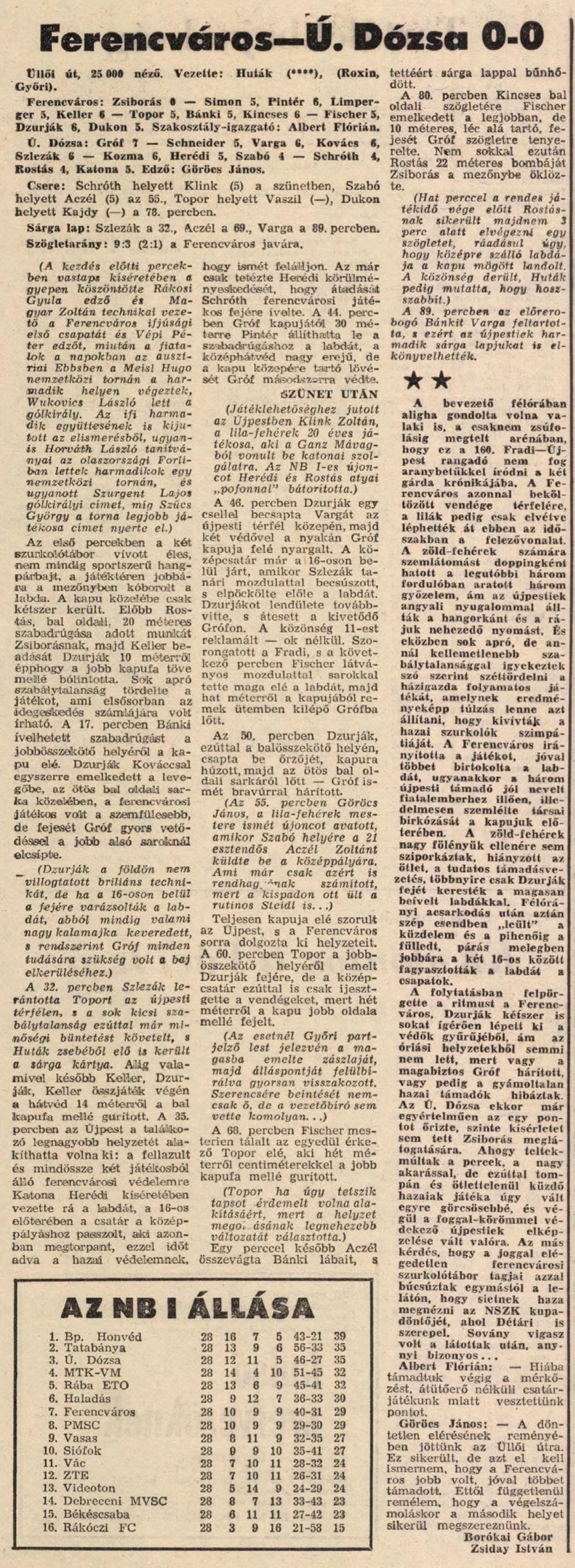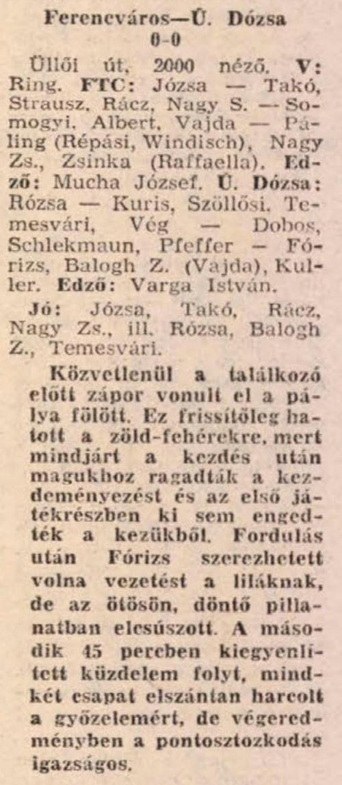 A válogatott sértésekkel egymást köszöntgető szurkolótáborok már félórával a rangadónak ítélt összecsapás előtt megkezdték hangpárbajukat. Ebben az is tükröződött, hogy a nézősereg nagy csatát, színvonalas küzdelmet remélt az igazi főszereplőktől, a két csapat játékosaitól. A találkozó nyitó szakaszában szinte kizárólag ferencvárosi rohamok sorjáztak a zöld gyepen. Igaz, komoly veszélyt csak Dzurják váratlan bombája jelentett, ám a pontatlan célzás miatt nem született találat. A negyedórás ferencváros ,,puhítás,, után a vendégek is éledni látszottak, de próbálkozásaik Zsiborásnak inkább csak az idegeit tették próbára, reflexeit kevésbé. A játék színvonala nem járt éppen a fellegekben, kárpótolta viszont a hiányérzetet a lelkesedés, amiben a hazaiak jártak elöl jó példával. A küzdőkedv olykor szép támadásokban is testet öltött, az egyik ilyen végén a termetes Dzurják ügyesen fejelt a jobb kapufa tövéhez, ám Gróf résen volt és időben érkezett. Az első 45 perc közepére teljesen elmúlt a Dózsa eleinte nagyon is érzékelhető félszegsége, és védelme mind bátrabban nyúlt a lestaktika egyébiránt nem veszélytelen fegyveréhez. Fütyültek is a hazai nézők, de a legkevésbé a játékvezető tehetett arról, hogy az FTC figyelmetlen csatárai rendre lesre futottak. Amikor jobban vigyáztak, azonnal ismét volt veszély a zöld-fehérek akcióiban, ám az egykapuzás ellenére sem született gól.
