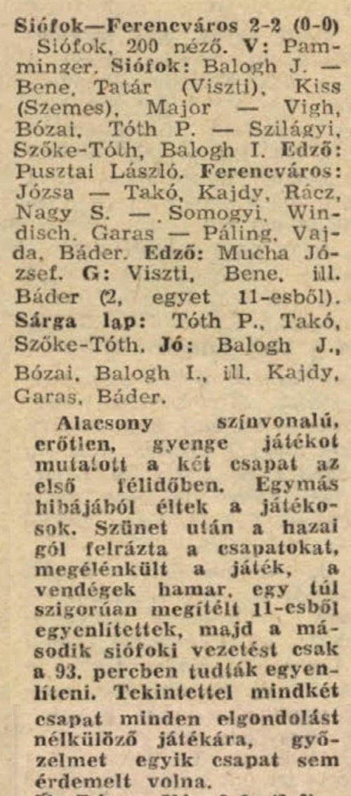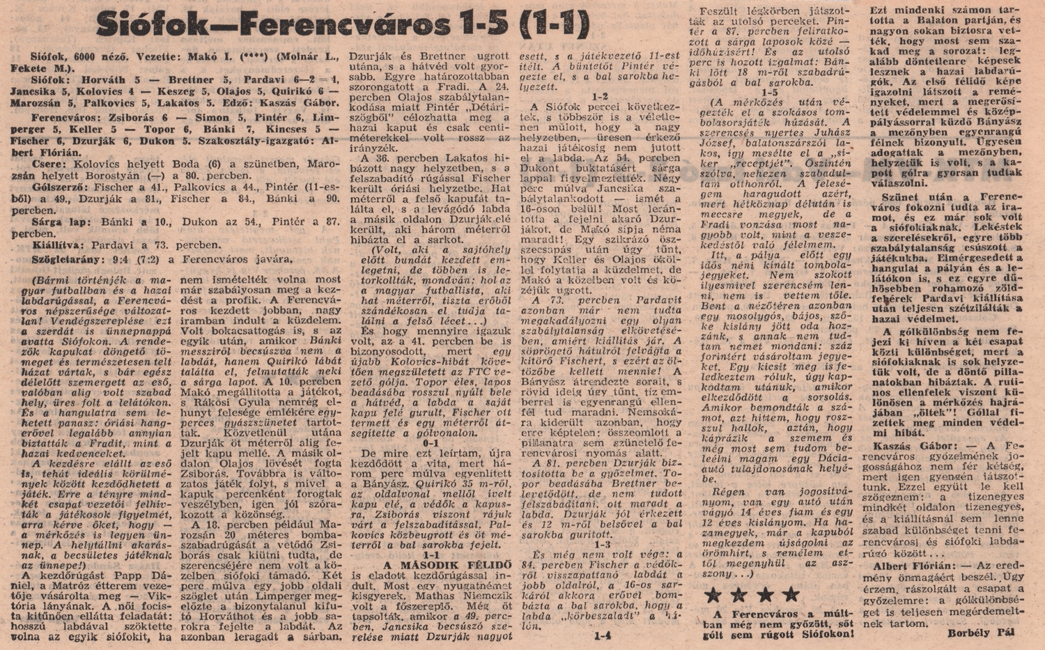 A második félidő igen rosszul kezdődött a Siófok részére, mert 11-esből újból a fővárosi csapat szerzett vezetést. A büntető nagyon megzavarta az egyébként is gyengén játszó hazaiakat (az utolsó húsz percet tíz emberrel játszották végig), és a Ferencváros felülkerekedve, könnyen szerezte meg nagy arányú győzelmét, ami egy kicsit túlzott.