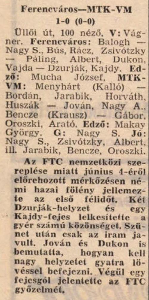 Ferencváros: Zsiborás – Vaszil, Simon, Limperger, Keller – Topor, Bánki, Kincses – Fischer, Dzurják, Dukon