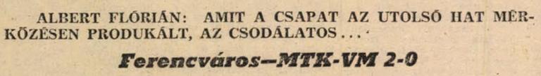 Albert Flórián: – Amit a csapat az utolsó hat mérkőzésen produkált, az csodálatos. Tizenegy pontot gyűjtöttünk, s azt hiszem, ez mindennél többet mond, ezért valamennyi játékosnak csak szívből gratulálni tudok.