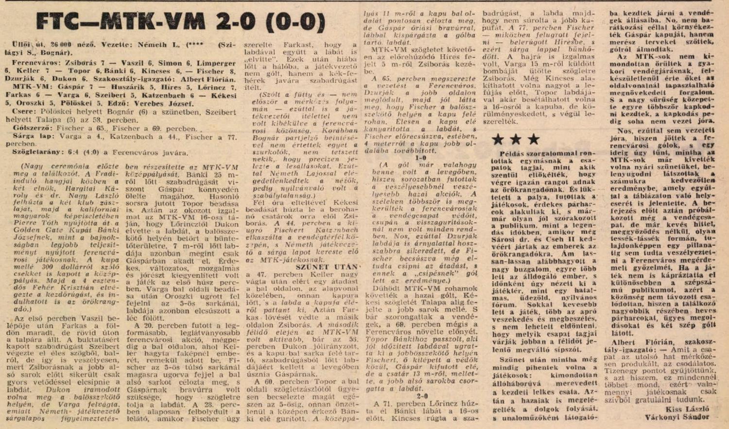 MTK VM: Gáspár – Farkas, Hires, Lőrincz, Huszárik – Kékesi, Varga, Katzenbach – Oroszki, Szeibert (Talapa 58.), Pölöskei (Bognár 46.)