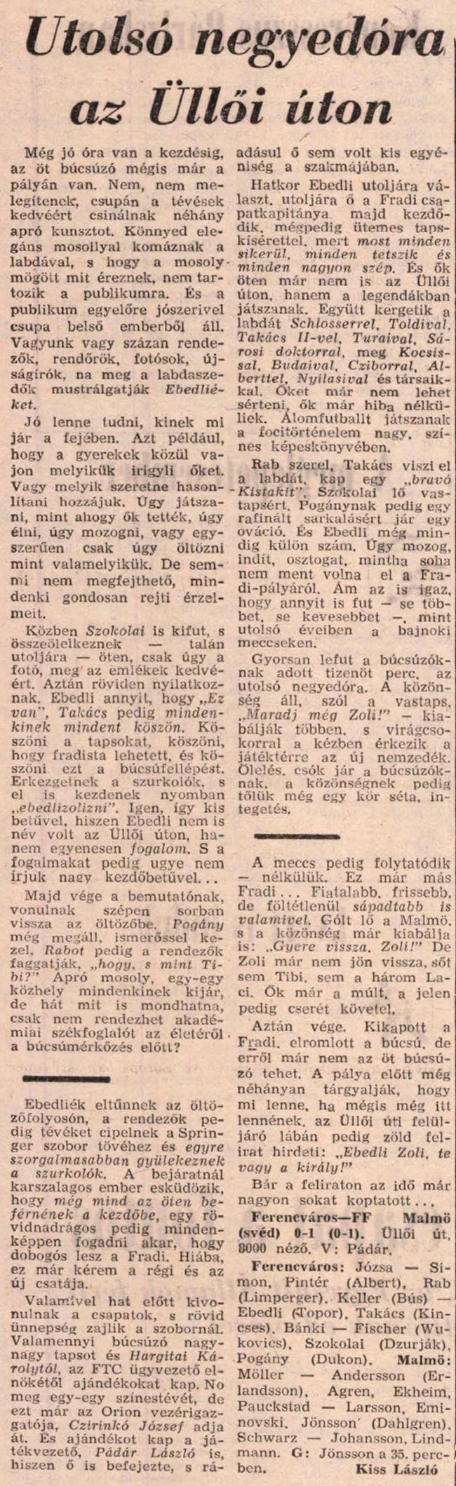 Mintha csak tegnap történt volna. A hetvenes évek közepén Dalnoki Jenő, a Ferencváros akkori edzője remek kis csapatot hozott össze. Az ifjú titánokkal telitüzdelt zöld-fehér gárda sikert sikerre halmozott, bajnokságot, MNK-t nyert, KEK-döntőt vívhatott a Dinamo Kijevvel. Az akkori csapatban mint a jövő nagy tehetségeit tartották számon Ebedli Zoltánt (Ebedliről még tudni kell, hogy nála többször csak a legendás hírű Sárosi György játszott az FTC színeiben), Pogány Lászlót, Rab Tibort, Takács Lászlót és a később odaigazolt Szokolai Lászlót. És alig tíz évvel később ezek a játékosok sok nagy csata hőseként, sokszoros válogatottként szombaton délután hivatalosan is elbúcsúztak az Üllői úti közönségtől. A búcsúmérkőzésre a volt BEK-döntős, sokszoros bajnok svéd FF Malmőt hívták meg (A két együttes legutóbb 1975-ben, a KEK-ben találkozott. A Ferencváros idegenben 3:1-re győzött, hazai pályán pedig 1:1 arányú döntetlennel biztosította a továbbjutást) . A találkozó előtt a Springer szobornál Hargitai Károly, az FTC ügyvezető elnöke köszöntötte az öt búcsúzó játékost, majd az Orionnal közösen egy-egy színes televíziót adott át az ünnepelteknek. Ebedli, Takács, Pogány, Szokolai és Rab összesen 2.215 alkalommal húzhatták magukra a zöld-fehér mezt. Közülük Ebedli, Rab és Szokolai a válogatottban is bizonyította tehetségét.