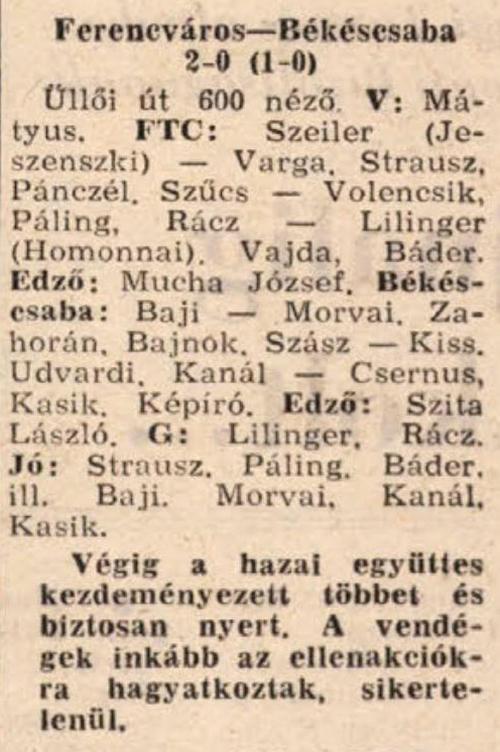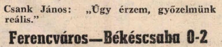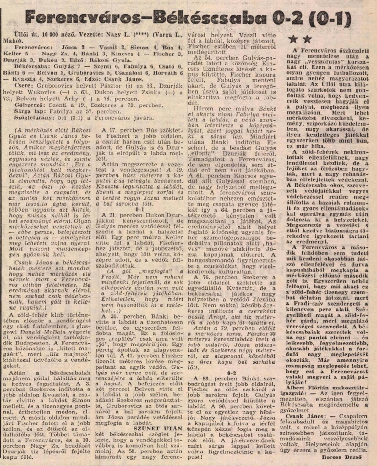 A Ferencváros nagy őszi menetelése ezúttal vesszőfutással folytatódott: a lelkes Békéscsaba győzni tudott az Üllői úton. Jellemző, hogy a hazai együttesből egyetlen játékos sem nyújtott átlagos, vagy annál jobb teljesitményt.