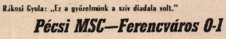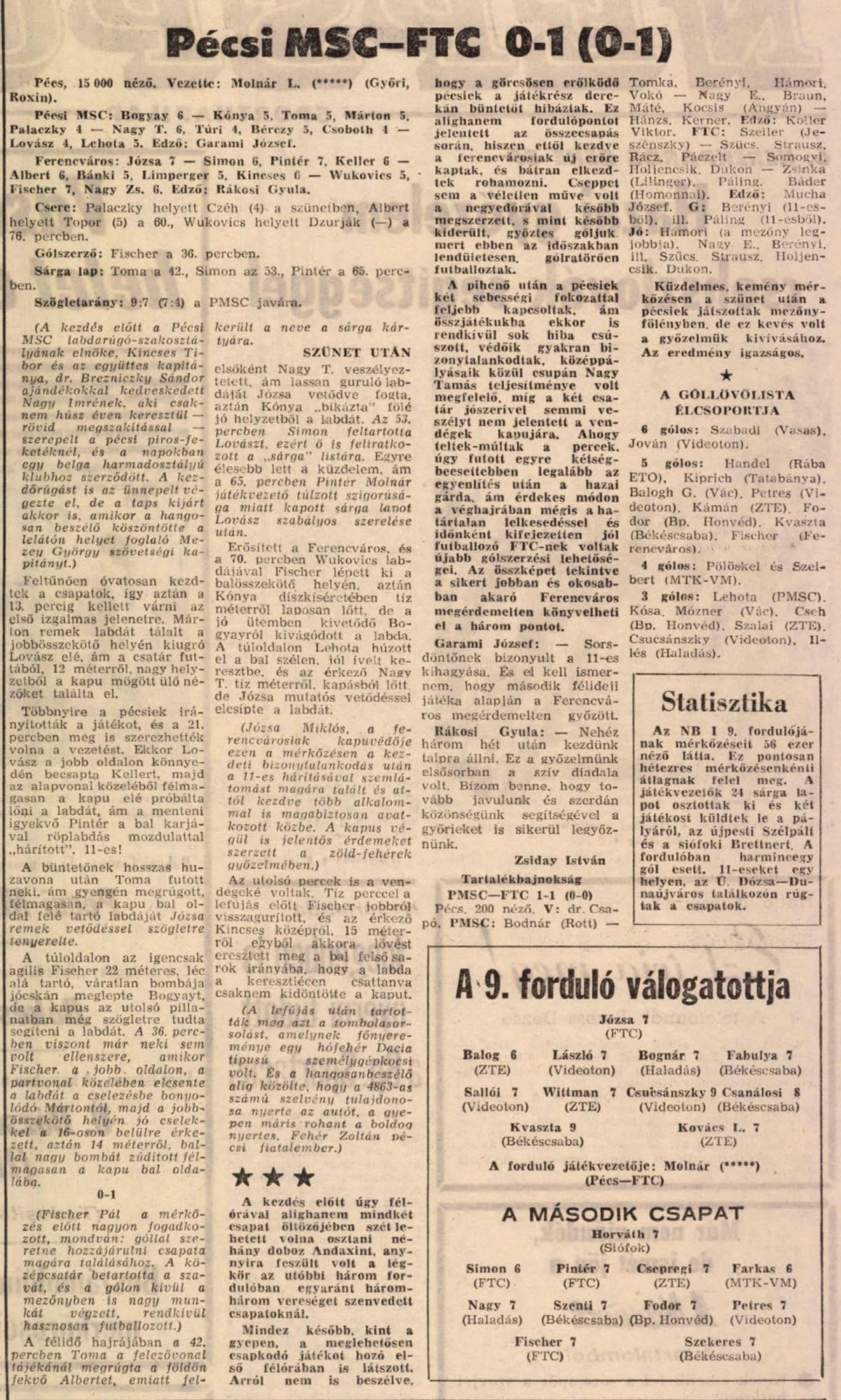 Egy kihagyott büntető, egy szemfüles gól és vérszegény hazai támadások jellemezték a mérkőzést. Mindkét csapat nagy elszántsággal és lendülettel kezdett, de fölényt hosszú ideig egyik sem tudott kiharcolni. A játék többnyire a pálya közepén folyt, s a támadások nemigen jutottak el a kapukig. Csak 14 perc után tudott először Lovász kapura lőni, majd két perc múlva Fischer gyenge fejese adott munkát Bogyaynak. Az izgalmakat a 21. percben Molnár játékvezető biztosította: Lovász jobboldali éles beívelése Pintér karján csattant, és a bíró meglepetésre a 11-es pontra mutatott. Toma a büntetőt félmagasan a kapu bal oldala felé helyezte, de Józsa vetődve kiöklözte a labdát. Ezt követően Fischer bombája adott munkát Bogyaynak. Fölénybe került a vendégcsapat. A 35. percben a kaputól mintegy 25 méterre Fischer Mártontól elvette a labdát. Pár lépés után félmagas lövést eresztett meg, és a labda a kapuban kötött ki (1:0).